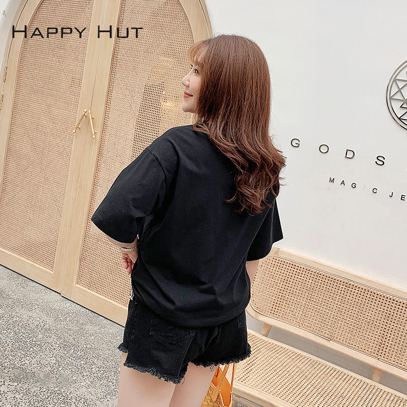 เสื้อยืดแขนสั้นผ้าฝ้ายสีดำสำหรับผู้หญิง, เสื้อยืดผ้าฝ้ายระบายอากาศไซส์ใหญ่พิมพ์ลาย N7010ฤดูร้อนแฮปปี้ฮัท