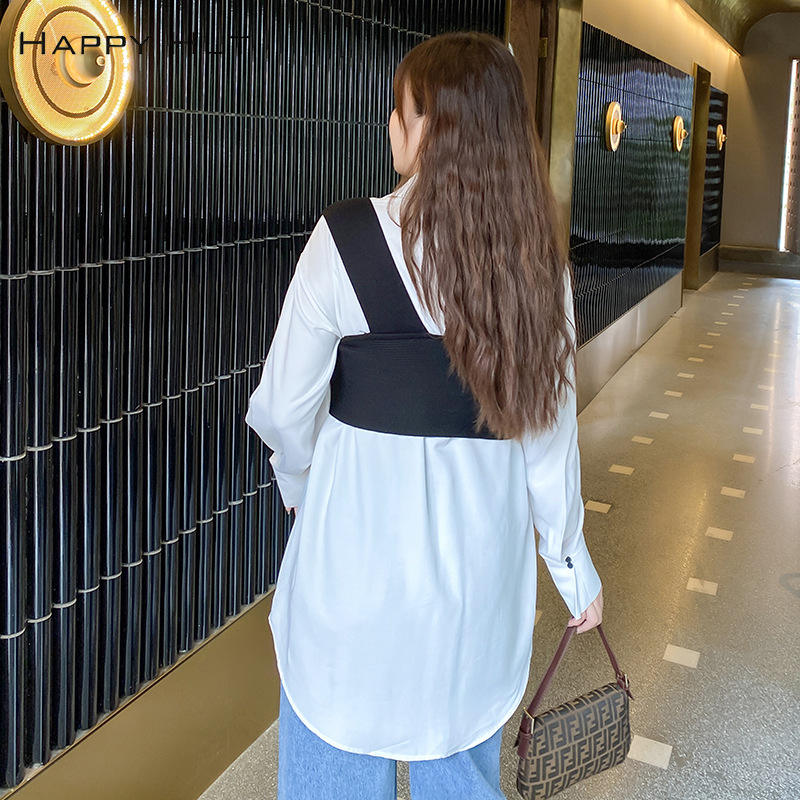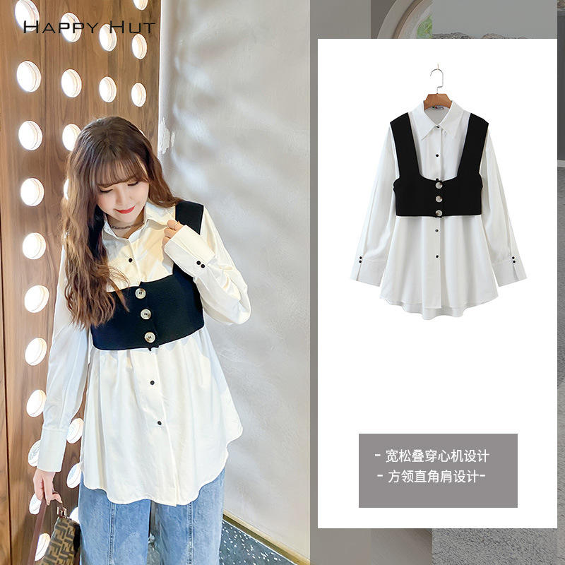 เสื้อเชิ้ตสีขาวสำหรับผู้หญิง Happy Hut พร้อมเสื้อกั๊กถักสีดำ คอเหลี่ยม ทรงหลวม ผ้าอ็อกซ์ฟอร์ด ไซส์พลัส เสื้อคลุม