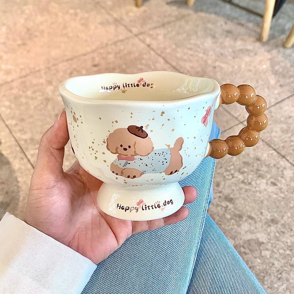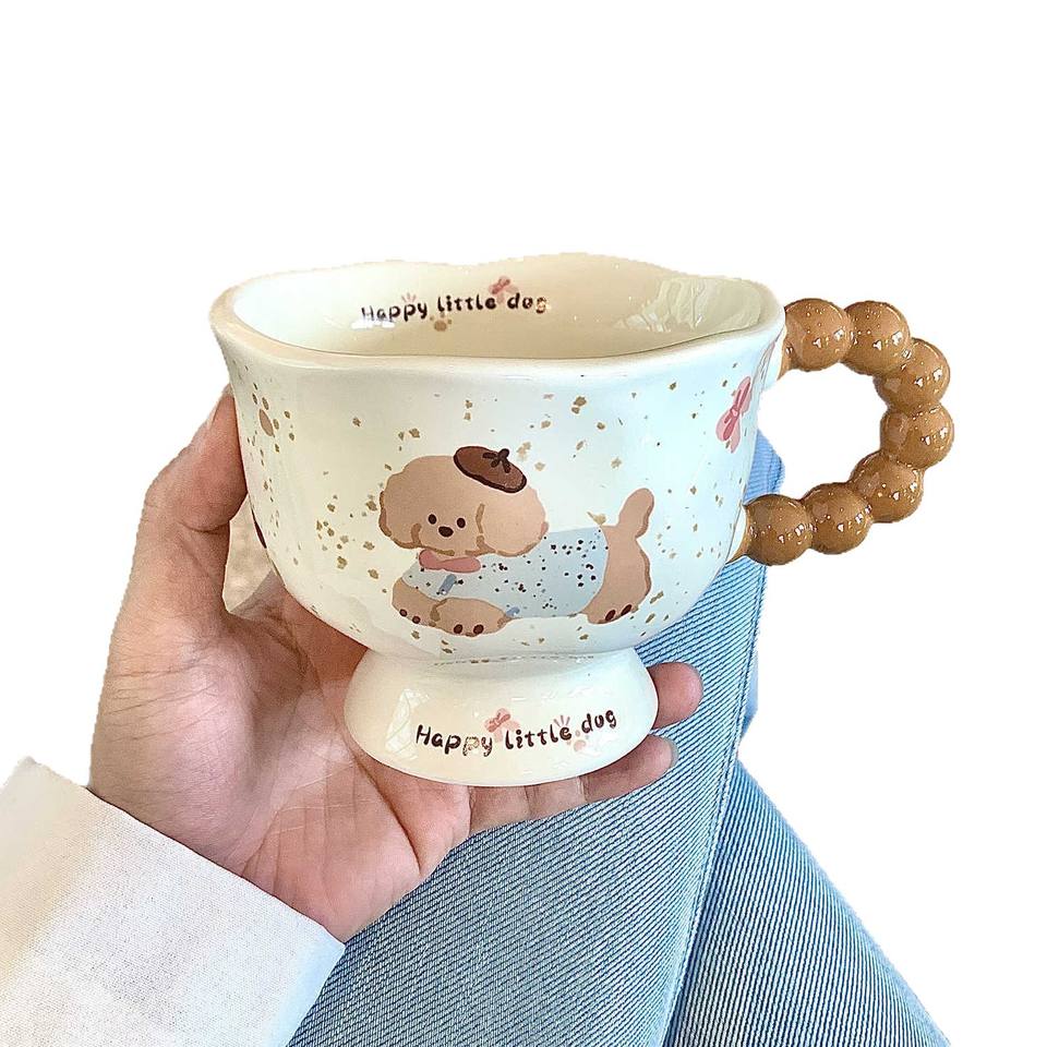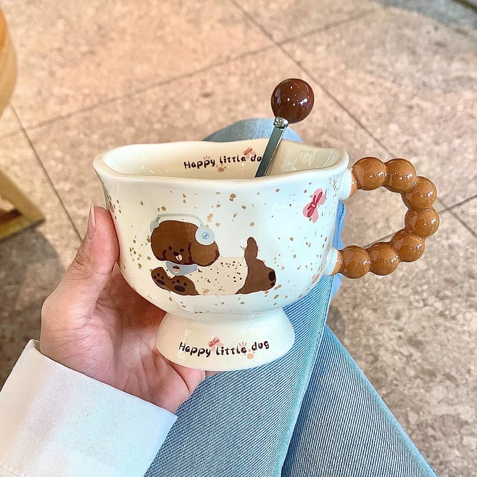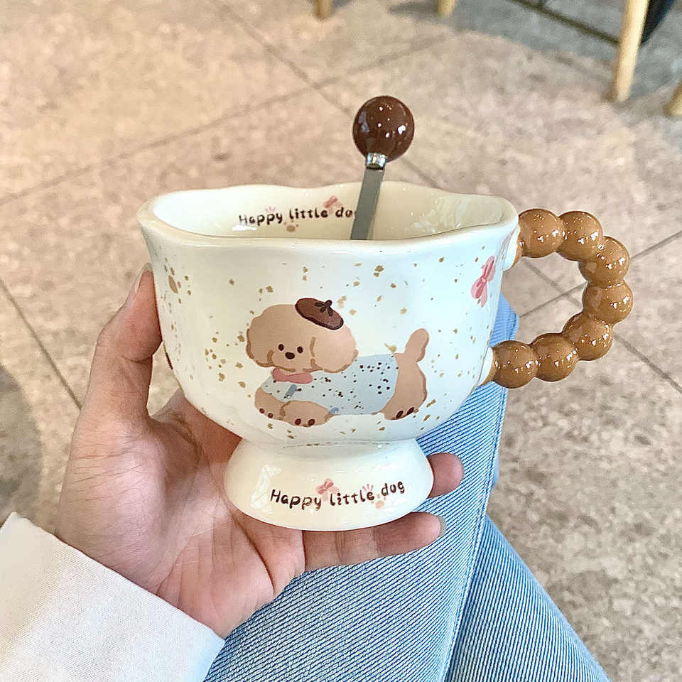 แก้วเซรามิกรูปสุนัขตัวเล็กน่ารัก พร้อมช้อนลายการ์ตูน เหมาะสำหรับอาหารเช้าหรือเป็นของขวัญ