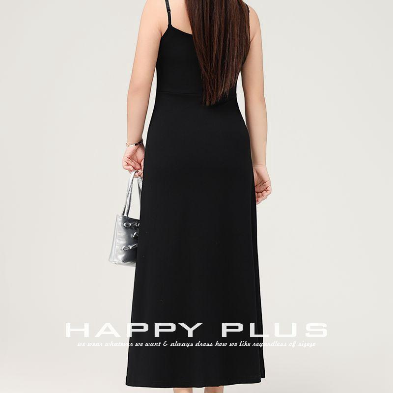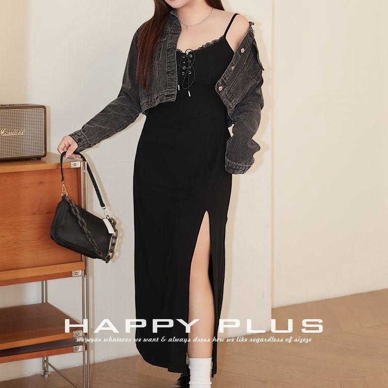 แฮปปี้ พลัสชุดเดรสยาวคอไขว้สีดำสำหรับผู้หญิงพลัสไซส์ทรงเอพร้อมรายละเอียดลูกไม้ N9186