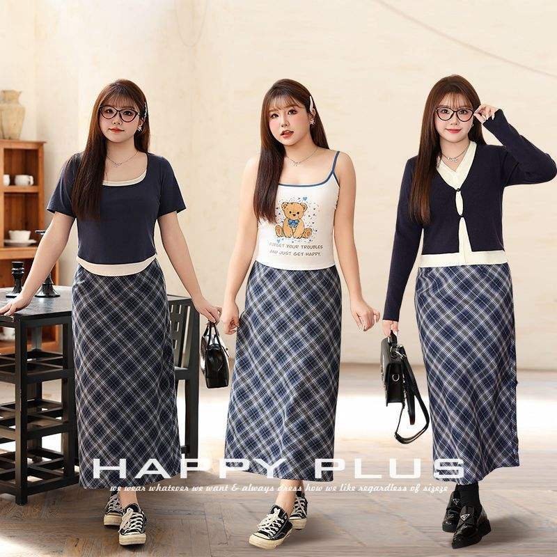 กระโปรงมิดิลายสก๊อตสีน้ำเงิน Happy Plus เอวธรรมชาติ ผ้าฝ้าย ไซส์พลัส สำหรับผู้หญิง ผ่าหลังสไตล์ Preppy