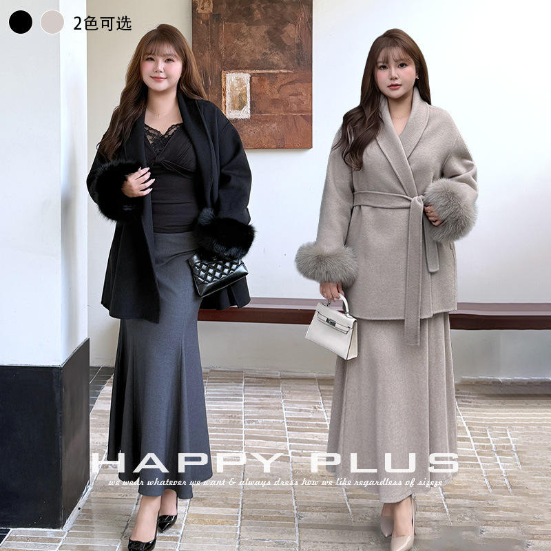 เสื้อโค้ทขนสัตว์สองด้าน Happy Plus ไซส์ใหญ่ ทรงหลวม แขนยาว สีโอ๊ตเมลโอ๊คเกรย์ แต่งขอบด้วยขนฟ็อกซ์