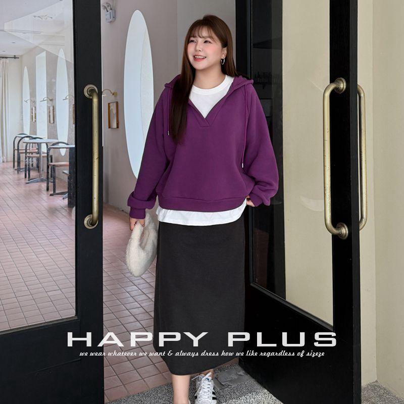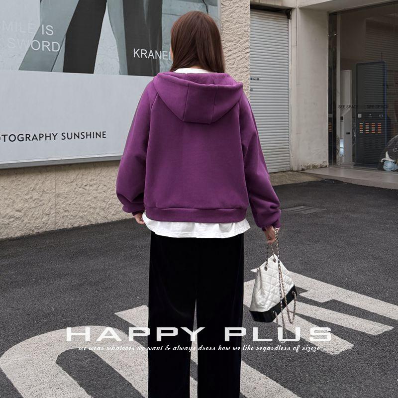 เสื้อสเวตเชิ้ตมีฮู้ดบุขนเฟลซ Happy Plus สีม่วงเทาเข้ม ไซส์พลัส สำหรับฤดูหนาว ทรงหลวม ใส่สบาย เหมาะสำหรับผู้หญิง สวมใส่เป็นเสื้อตัวนอกได้
