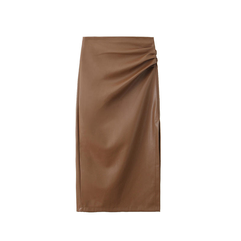 กระโปรงหนังทรงเอวสูงผ่าข้าง รุ่นแฮปปี้พลัส ไซส์พลัสสำหรับผู้หญิง ฤดูใบไม้ร่วง ฤดูหนาว สีพื้น หนัง PU สีน้ำตาลโกโก้ สีดำออโรร่า