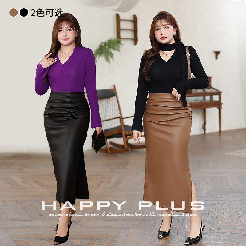 กระโปรงมิดิเอวสูง Happy Plus รุ่น N9017 สีดำออโรร่า ดีไซน์ผ่าข้าง ไซส์พลัสสำหรับผู้หญิง