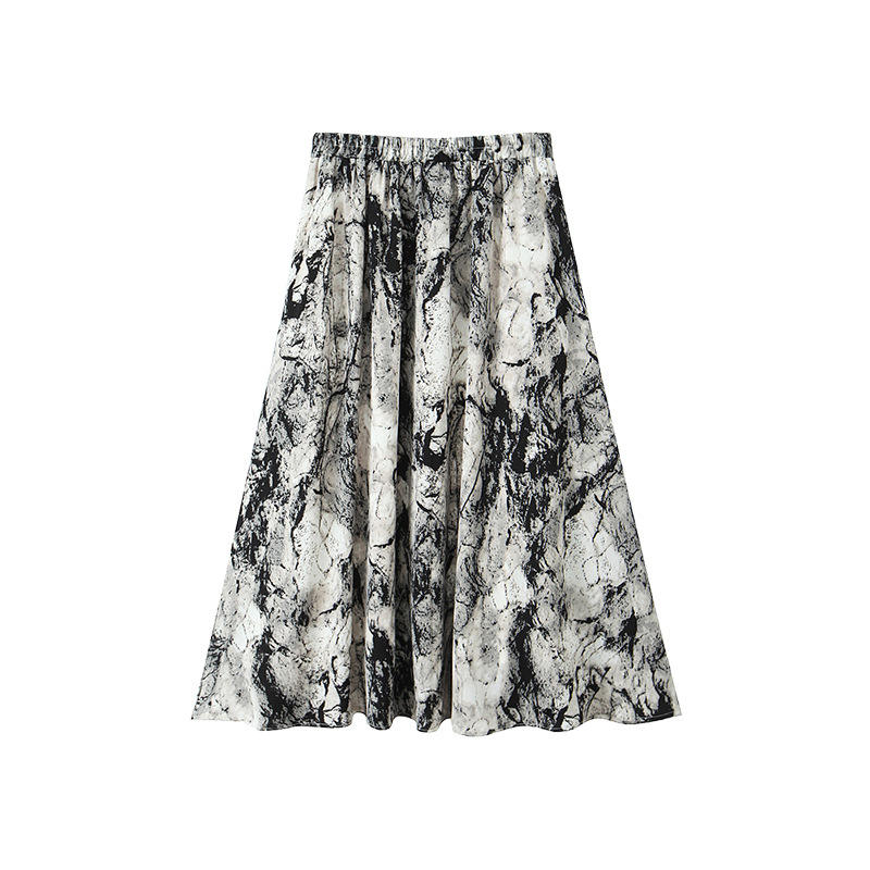 กระโปรงมิดิพิมพ์ลาย Happy Plus Ink Wash ไซส์พลัส เอวยางยืด กระโปรงทรงกว้างสำหรับผู้หญิง