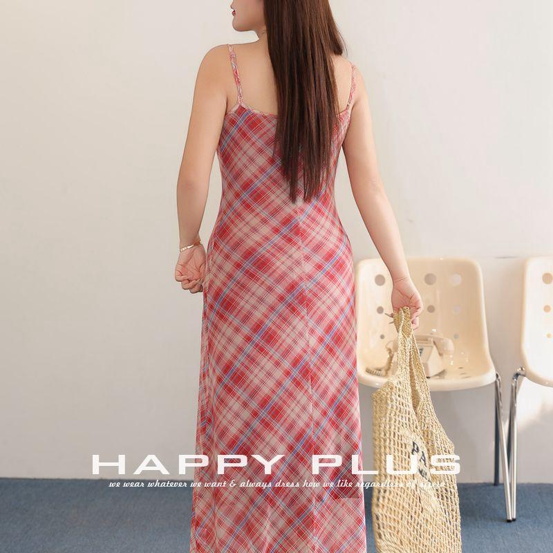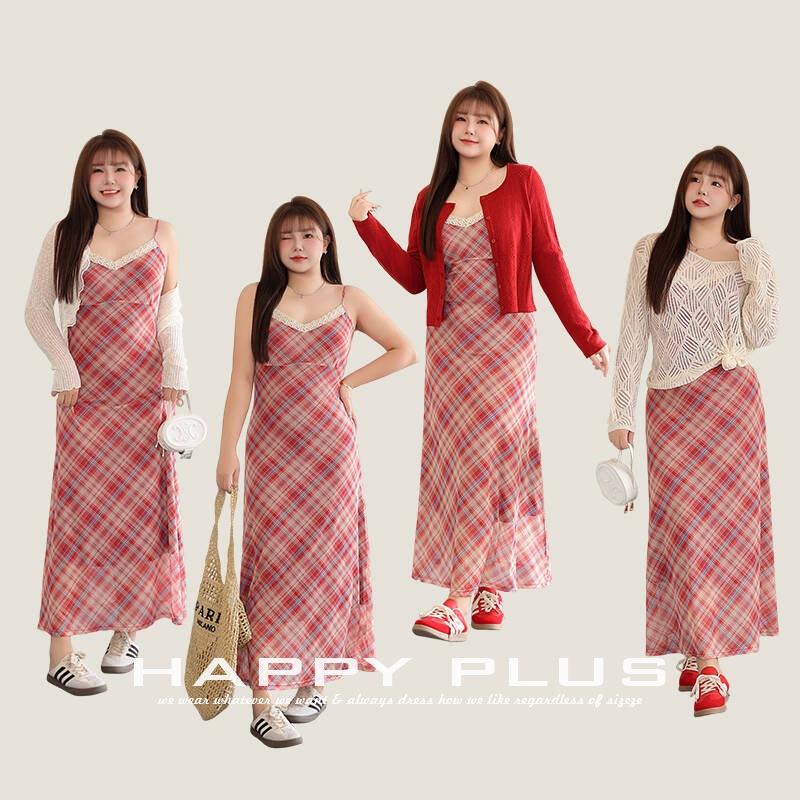 แฮปปี้ พลัส เลซชุดเดรสเอไลน์ลายสก๊อตคอวีสีแดงขนาดพลัสลำลองสวมใส่ได้ทุกวันหญิง N9161