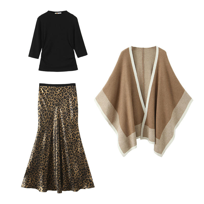กระโปรงมิดิสีดำทอง, เสื้อสีดำสนิท, ผ้าคลุมไหล่สีกากีสี