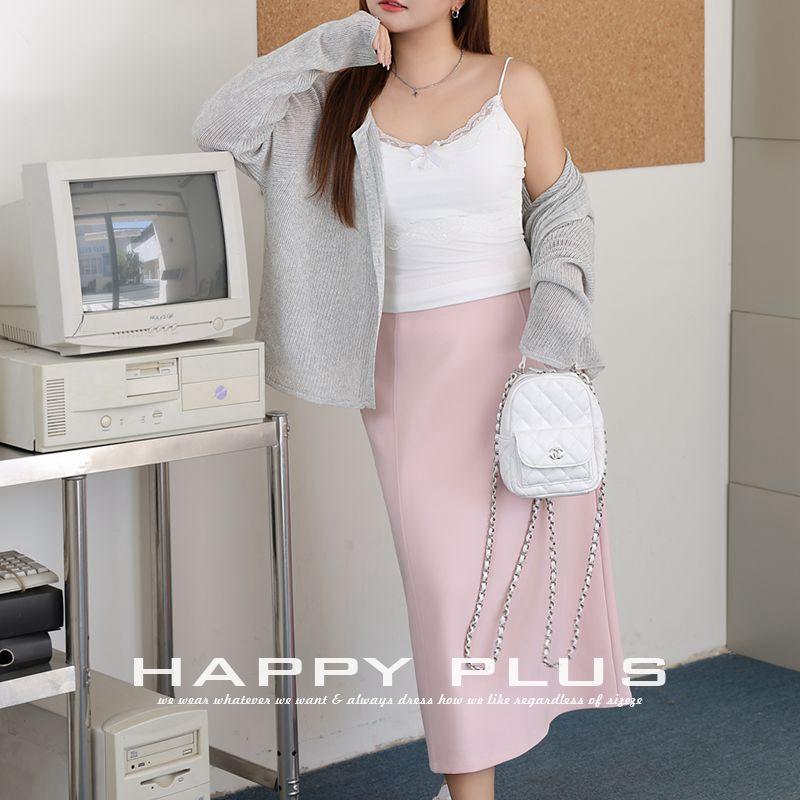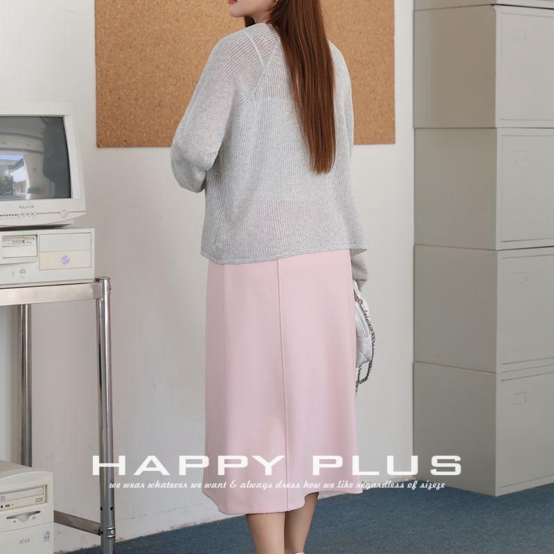 แฮปปี้ พลัส ชมพู กระโปรงมิดิเอวสูงผ้าซาตินทรงเอไซส์พลัสกระโปรงผู้หญิง N9239