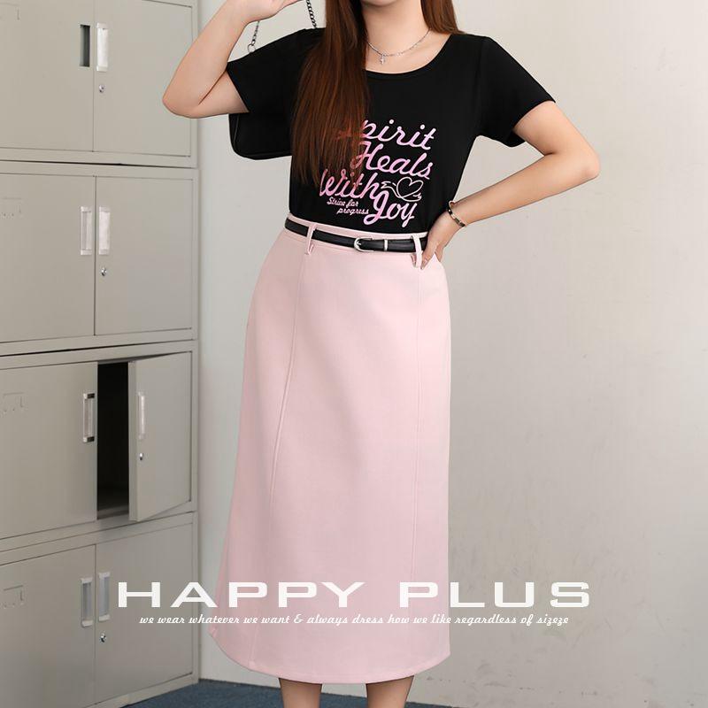 กระโปรงทรงเอเอวสูงสีชมพู Happy Plus รุ่น Midi ไซส์ใหญ่ ผ้าฝ้ายสีพื้น ยืดหยุ่นเล็กน้อย สำหรับผู้หญิง