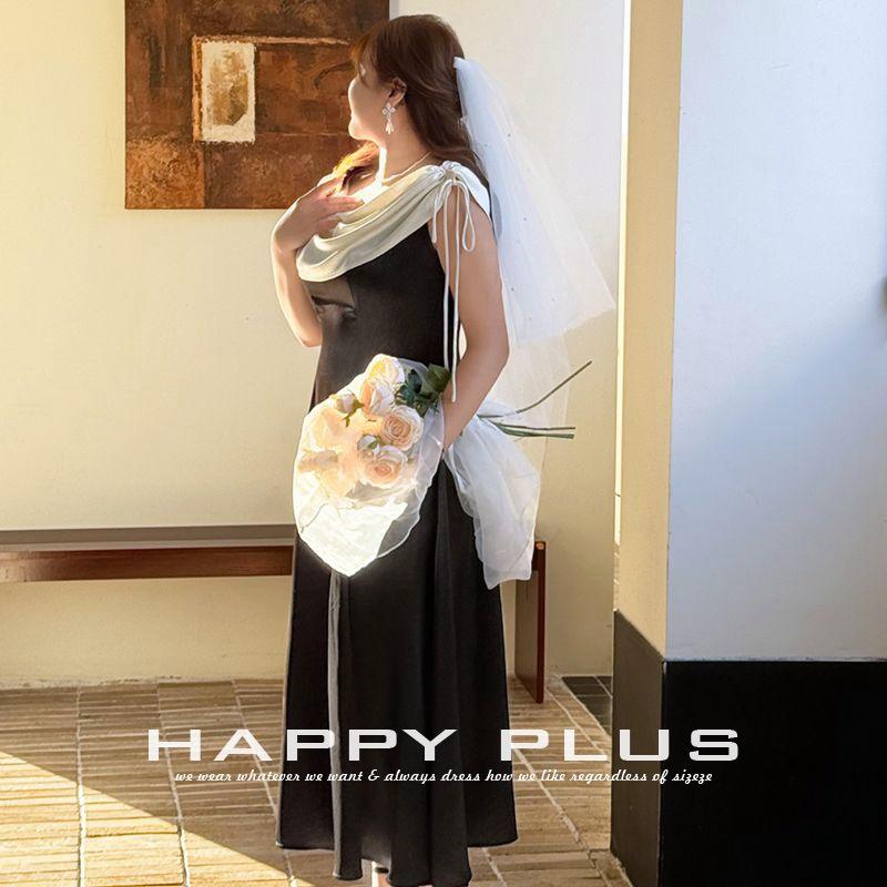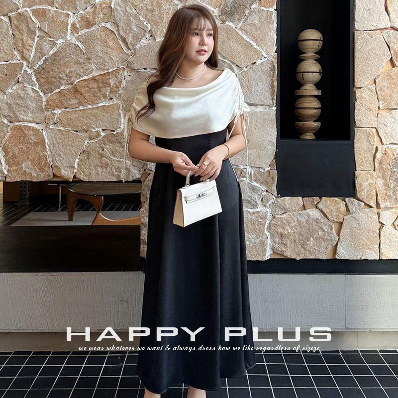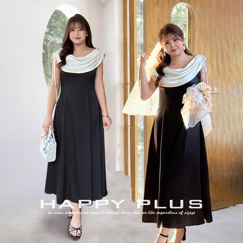 เดรสผ้าซาตินต่อผ้าแบบคอเต่า ทรงเอ็มไพร์ ไซส์พลัส สีตัดกัน เหมาะสำหรับงานเลี้ยง งานปาร์ตี้ และใส่ในชีวิตประจำวัน