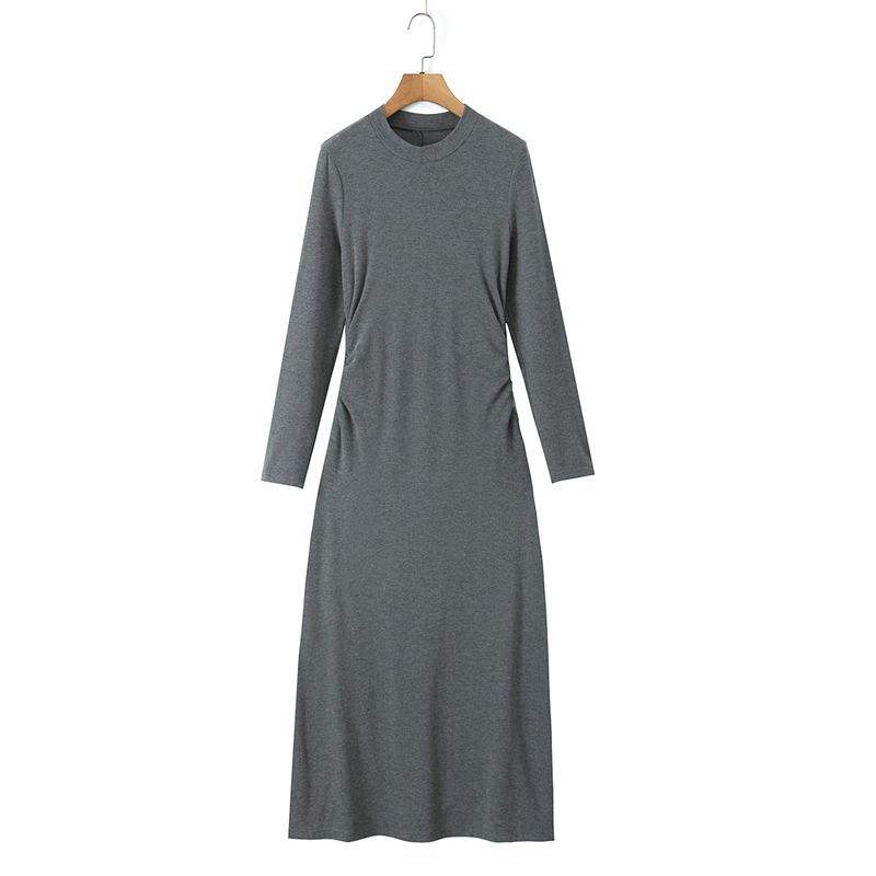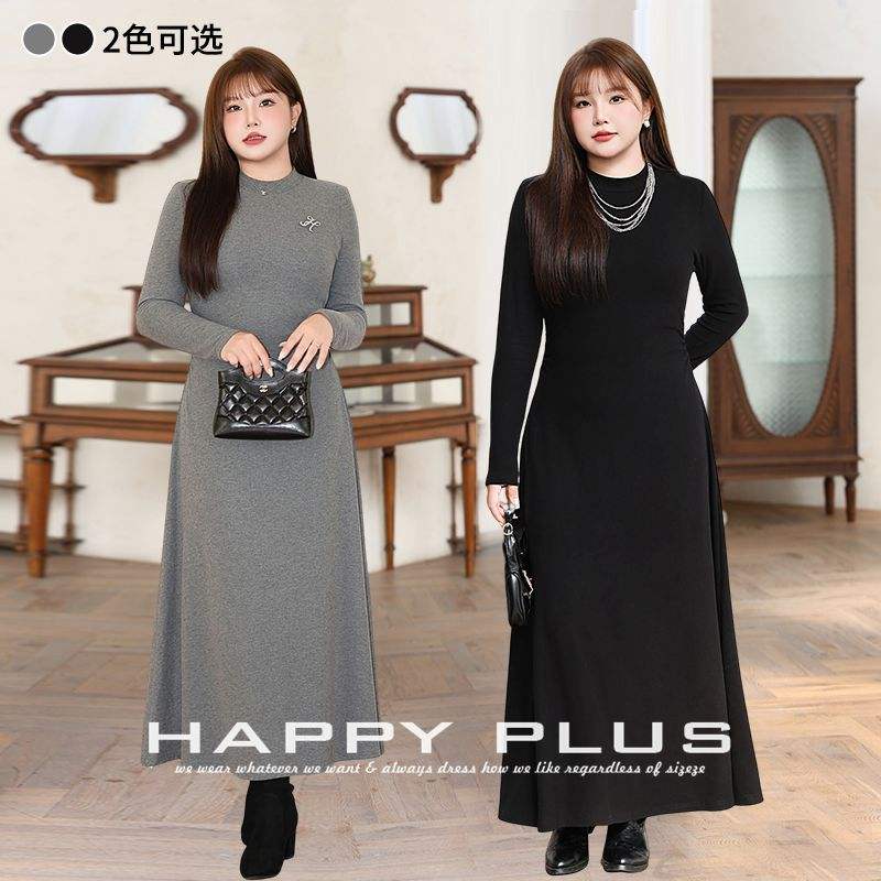 แฮปปี้ พลัสชุดเดรสแขนยาวคอโอจีบสีทึบสีเทาชุดเดรสผู้หญิงไซส์ใหญ่ N9097