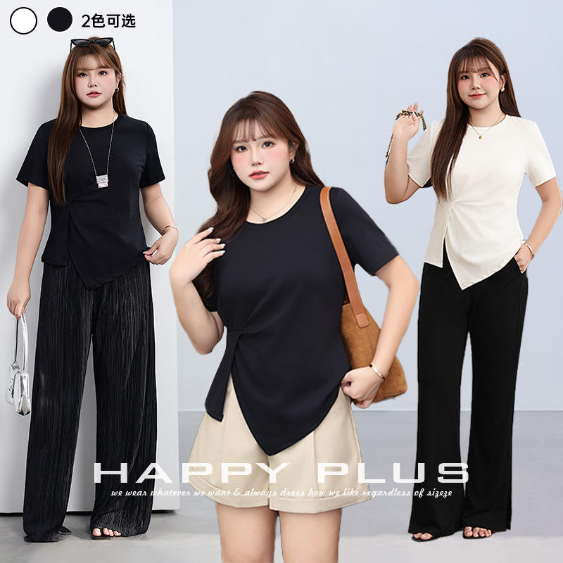 เสื้อยืดแฮปปี้พลัสไซส์ ทรงเอ สมมาตร ผูกด้านข้าง สีพื้น ผ้าเจอร์ซีย์ แขนสั้น สำหรับผู้หญิง