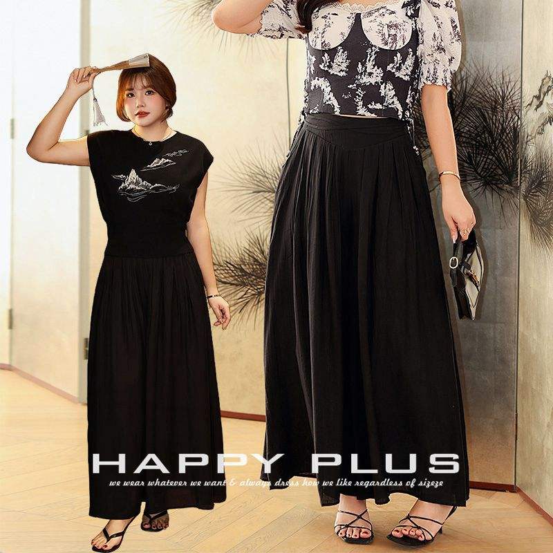 Happy PLUS กระโปรงพลีทเอวสูงขากว้างสำหรับผู้หญิง, กระโปรงยาวแฟชั่นผ้าไนลอนสีดำขนาดใหญ่พิเศษทรงหลวมพอดีตัวสำหรับ N8902