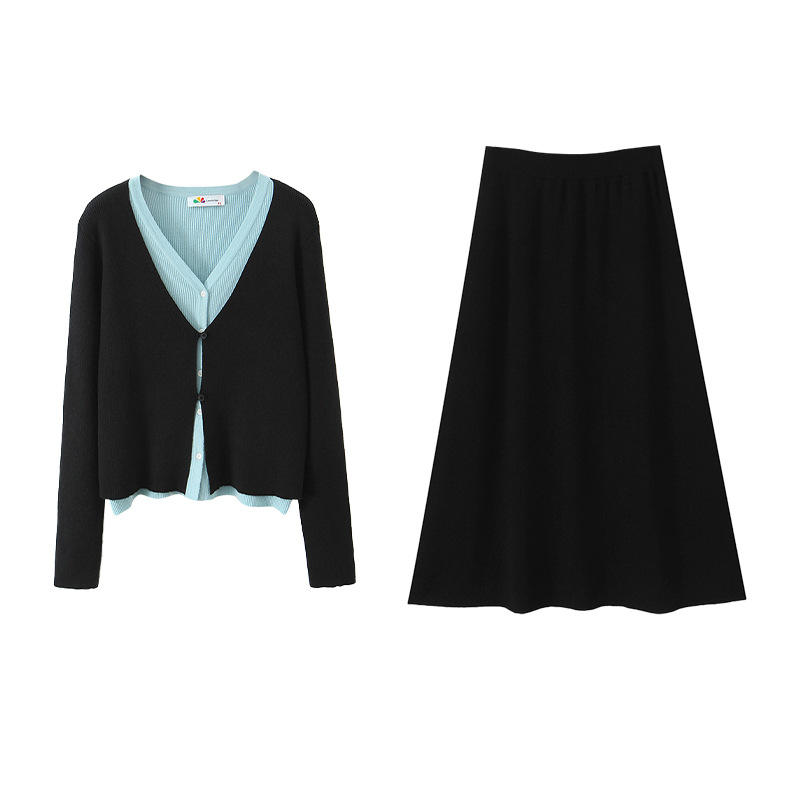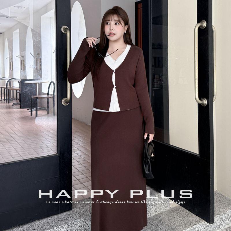 Happy Plus Women Knitted Cardigan Skirt Set Full Sleeve Solid Color V Neck Plus Size Autumn Winter Wear N9295