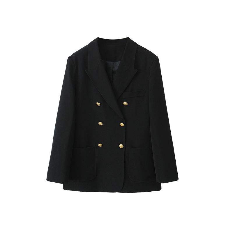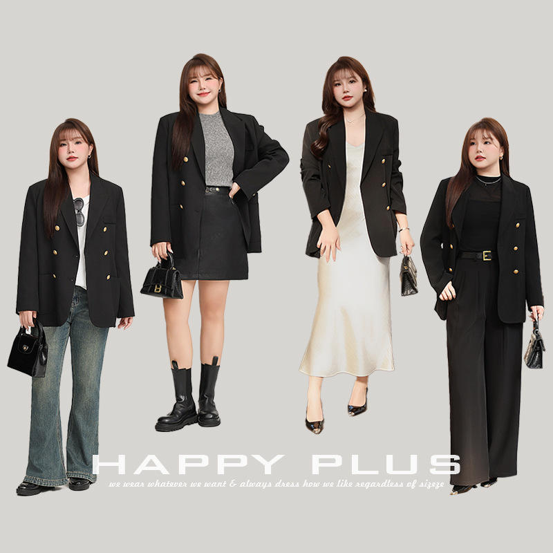 เสื้อสูทผู้หญิงสีดำแบบกระดุมสองแถว แบรนด์ Happy Plus รุ่น N9148 ทรงขากว้าง กระดุมสีทอง ไซส์พลัส เหมาะสำหรับใส่ไปทำงาน