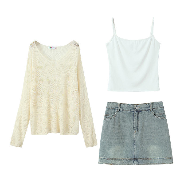 เสื้อคลุมสีแอปริคอต, เสื้อสายเดี่ยวสีขาว, กระโปรงมิดิสีฟ้าอ่อน
