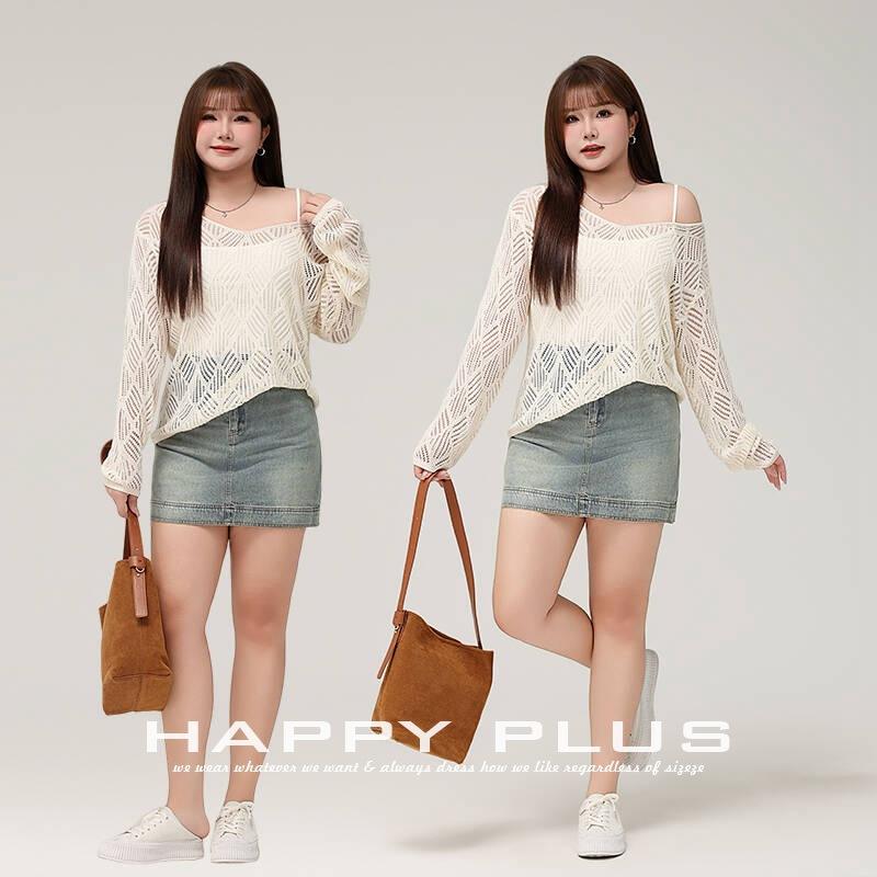 แฮปปี้ พลัสเสื้อถักไหมพรมผู้หญิง แขนยาว ทรงหลวม สีขาว ลำลอง ไซส์พลัส เสื้อถักนิตติ้งเนื้อนุ่ม N8920
