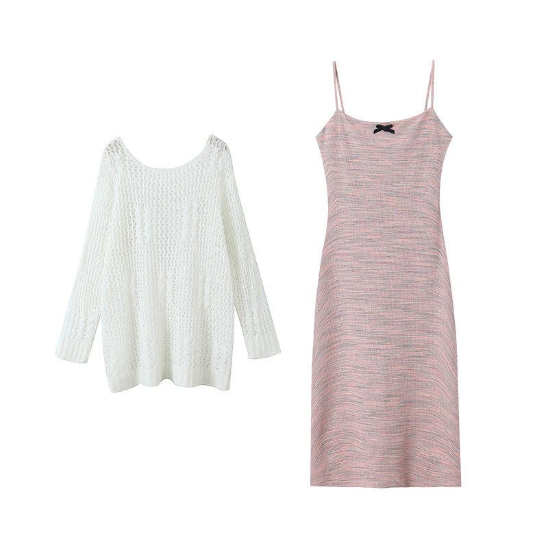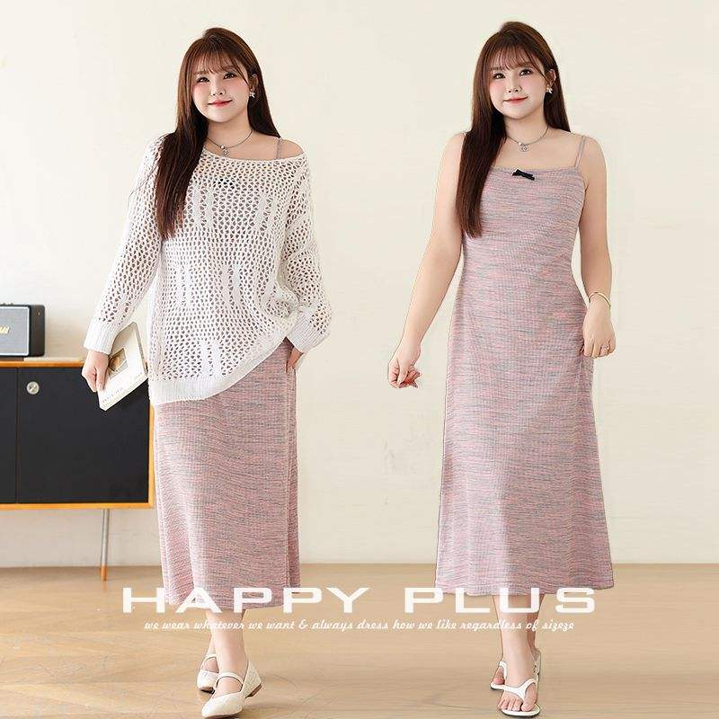 ชุดเดรสยาวทรงเอไลน์ถักนิตติ้งสำหรับผู้หญิง Happy Plus สีชมพู พร้อมเสื้อคลุมสีขาว ไซส์พลัส ชุดลำลองสำหรับฤดูร้อน