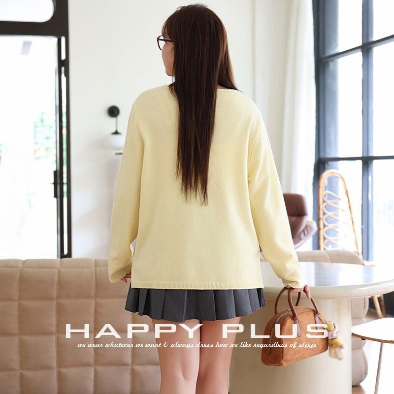 ชุดเสื้อสเวตเตอร์ถักผู้หญิงแฮปปี้ พลัสสีเหลืองจัสมิน คอวี ทรงหลวม พลัสไซส์ N9067 สีพื้น มีป้าย