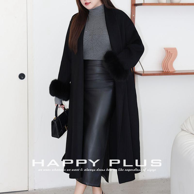 เสื้อโค้ทขนสัตว์ยาวสำหรับผู้หญิง Happy Plus พร้อมปลายแขนเสื้อขนสัตว์ ไซส์ใหญ่ เสื้อคลุมกันหนาวสีดำ เสื้อโค้ทอุ่นยาวสำหรับผู้หญิง