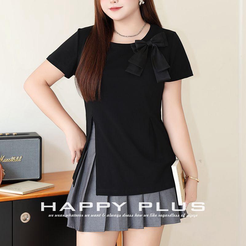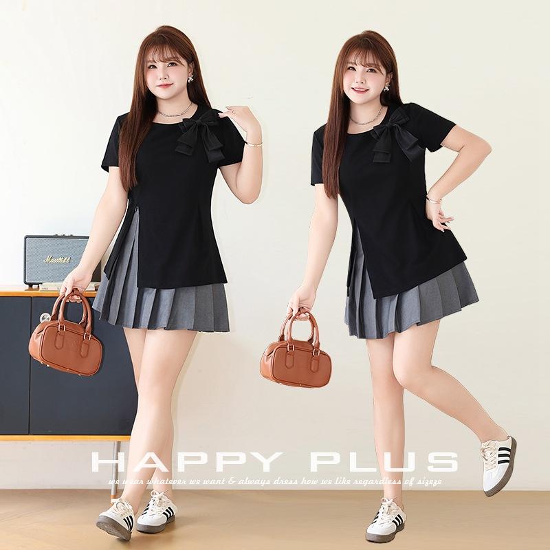 ชุดเซ็ตไซส์พลัสสำหรับผู้หญิง Happy Plus เสื้อสีดำ กระโปรงจีบสีเทา แขนสั้น ผ้าถักสีพื้น ดีไซน์โบว์