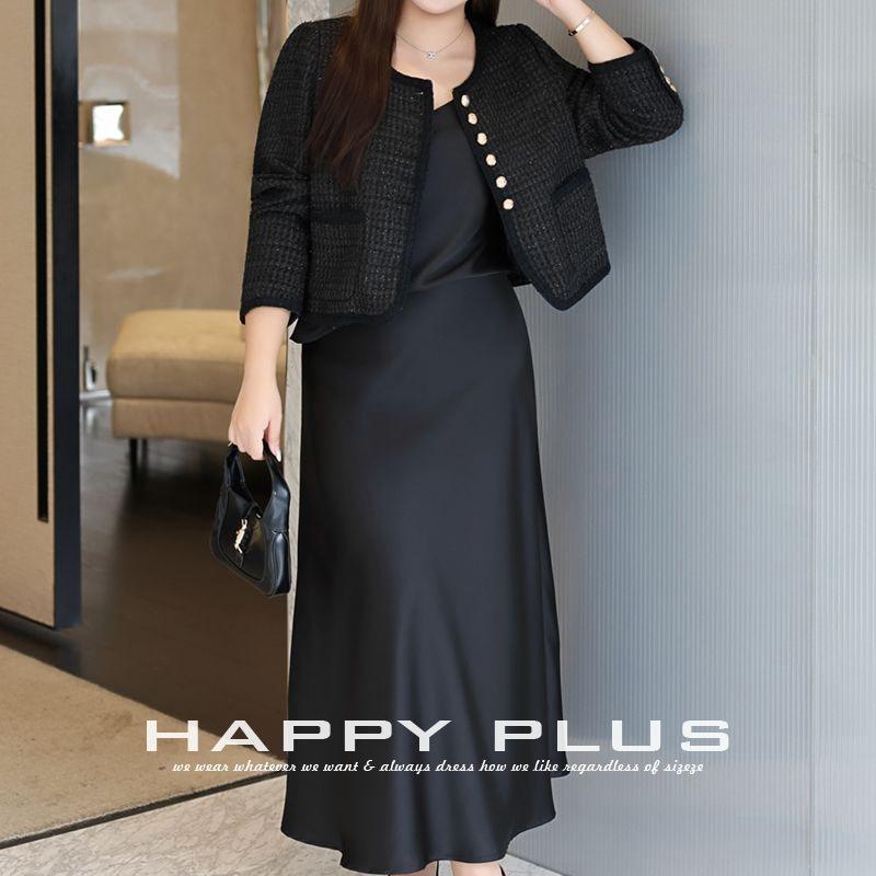Happy PLUS ชุดกระโปรงซาตินผู้หญิง, ชุดกระโปรงซาตินแขนยาวสีพื้นหางปลาเอวสูงป้องกัน N9314เป็นขน
