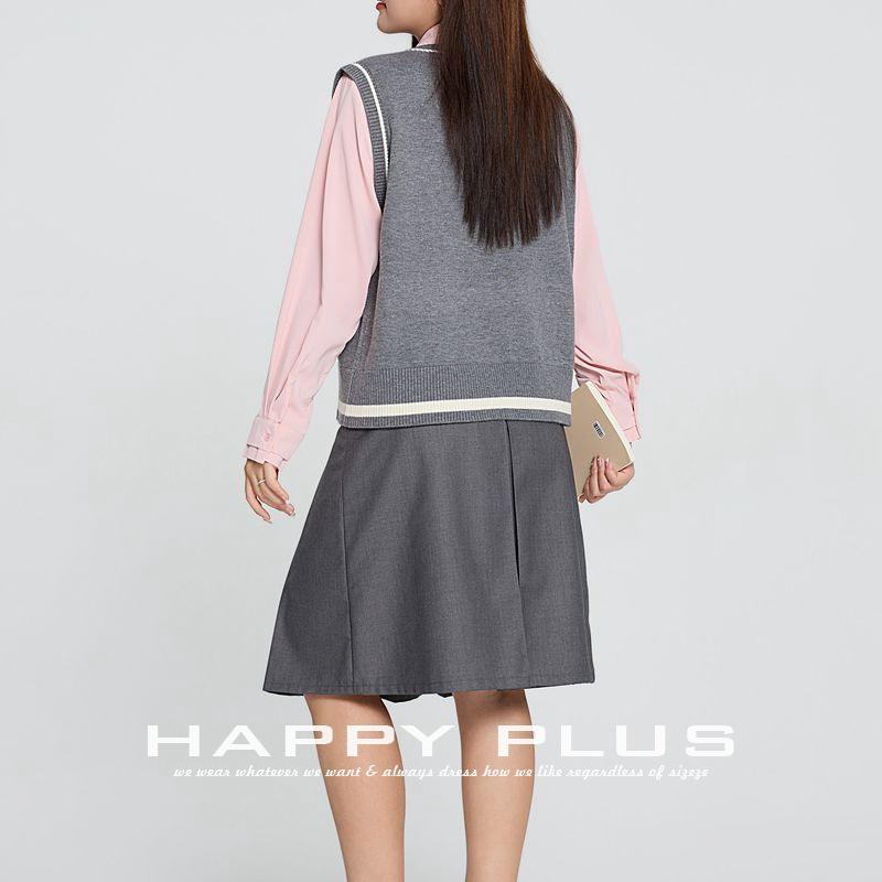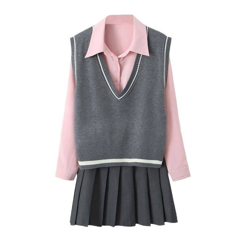 ชุดเสื้อกั๊กและกระโปรงพลีทสำหรับผู้หญิงไซส์ใหญ่ สีชมพูล้วน ผ้าถัก แขนยาว สไตล์ลำลอง ชุดเลเยอร์