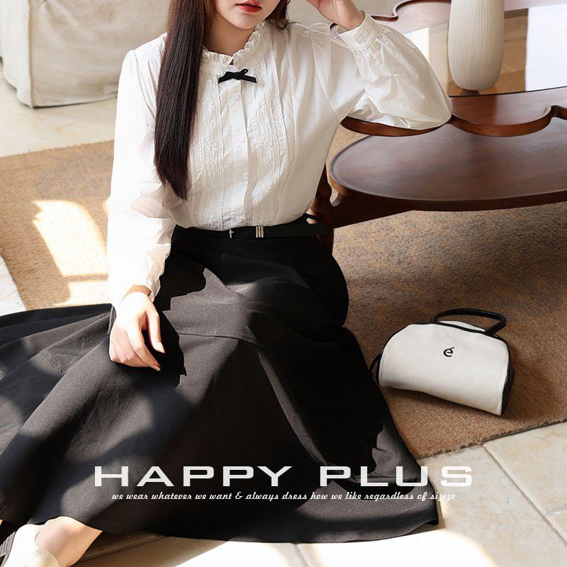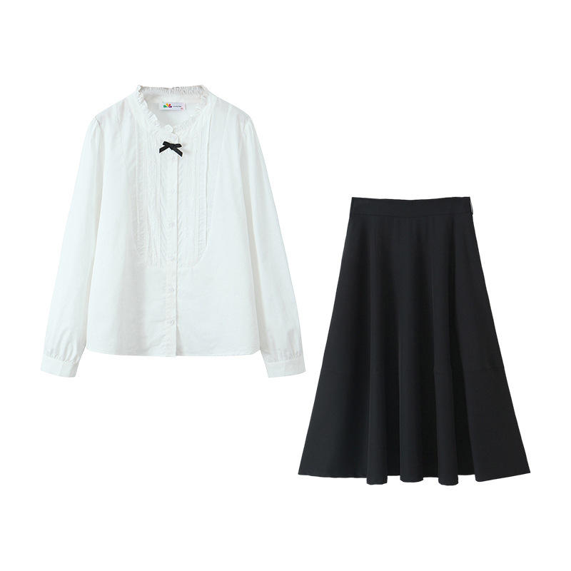 ชุดเสื้อเชิ้ตสีขาวและกระโปรงสีดำสำหรับผู้หญิงแฮปปี้พลัสแขนยาวผ้าฝ้ายอ็อกซ์ฟอร์ดสีพื้นพร้อมกระดุมดีไซน์ทรงเอไลน์