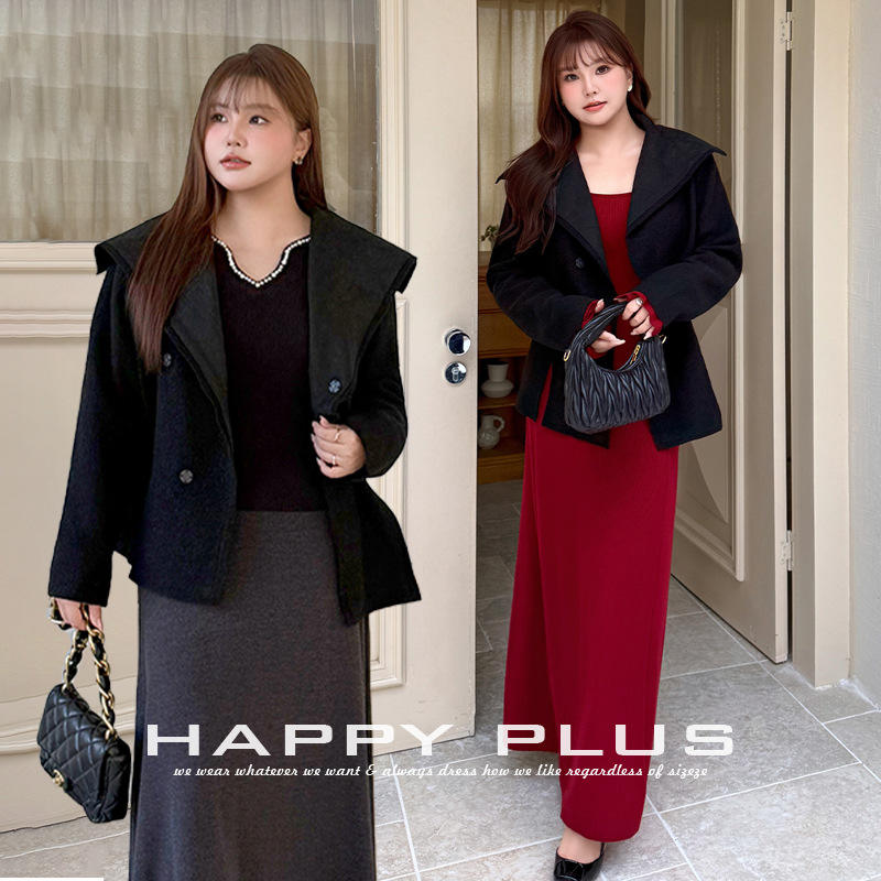 แฮปปี้ฮัทเสื้อโค้ทผสมขนสัตว์ แขนยาว ความหนาปานกลาง ปกเสื้อแบบอุ่น ด้านหน้า สำหรับผู้หญิง ไซส์พลัส เสื้อคลุมตัวนอก