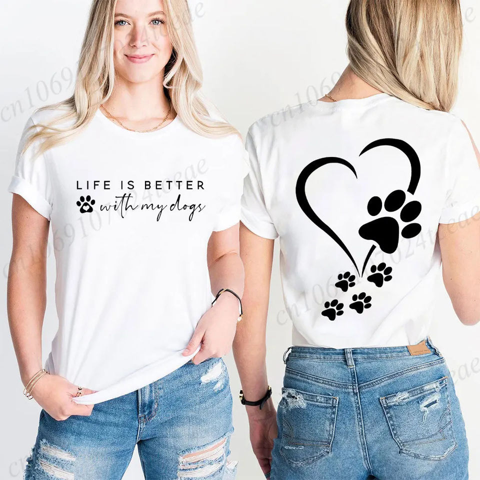 เสื้อฮาราจูกุแฟชั่นเสื้อยืดวินเทจแขนสั้นผู้หญิงเสื้อยืดชีวิตดีกว่ากับสุนัขของฉันเสื้อลำลองลายอุ้งเท้าสุนัขเสื้อหัวใจ