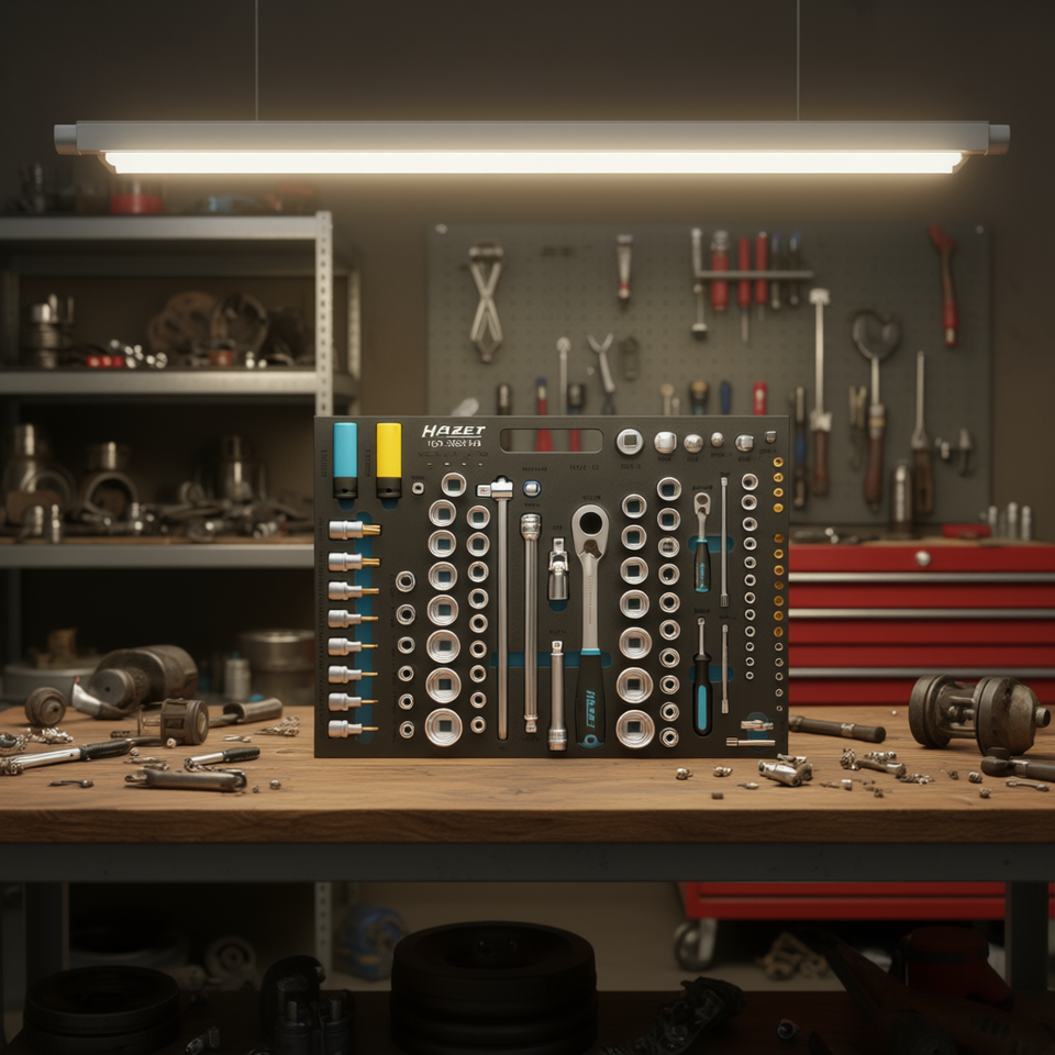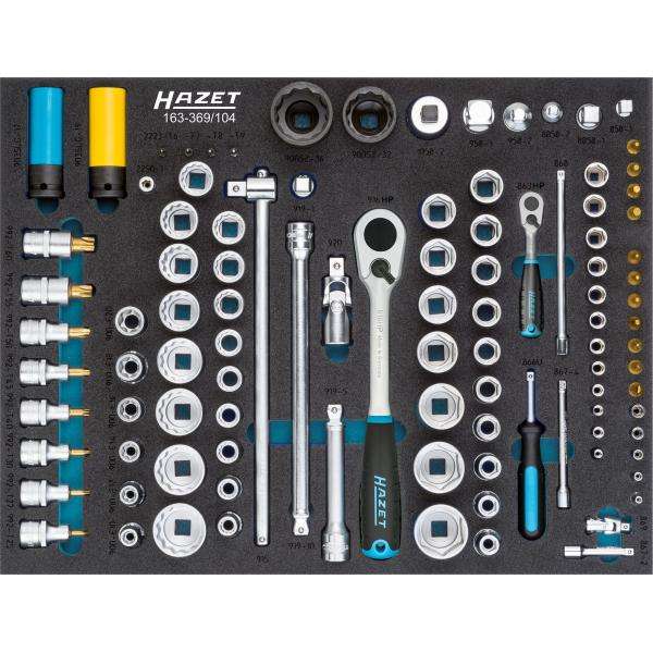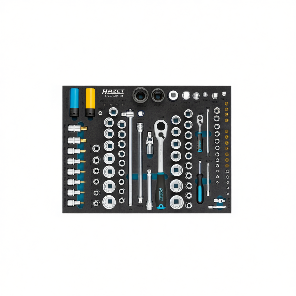 ชุดเครื่องมือ Hazet 104 ชิ้น พร้อมประแจวงล้อและอุปกรณ์เสริมขนาด 1/2 นิ้ว และ 1/4 นิ้ว