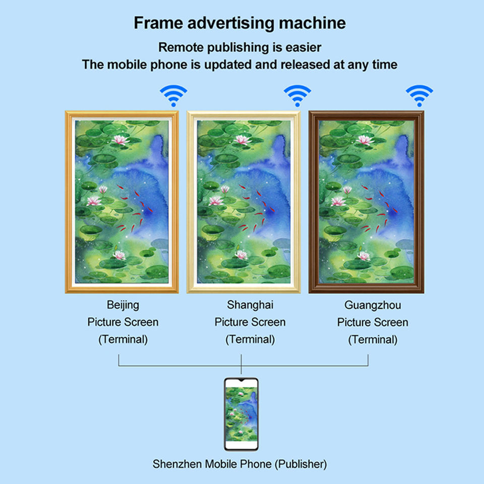 กรอบรูปอิเล็กทรอนิกส์แบบ HD ติดผนังเครื่องแสดงกรอบรูปดิจิตอลหน้าจอโฆษณาไม้เนื้อแข็ง