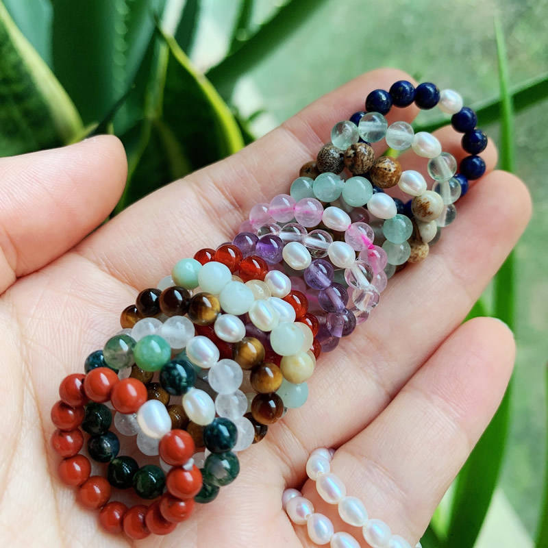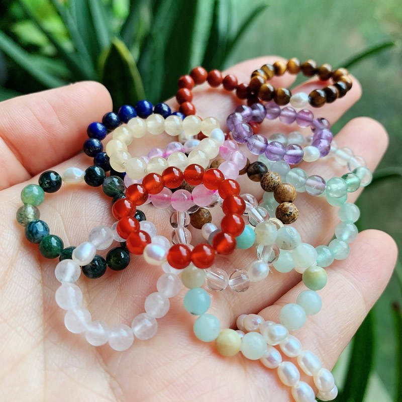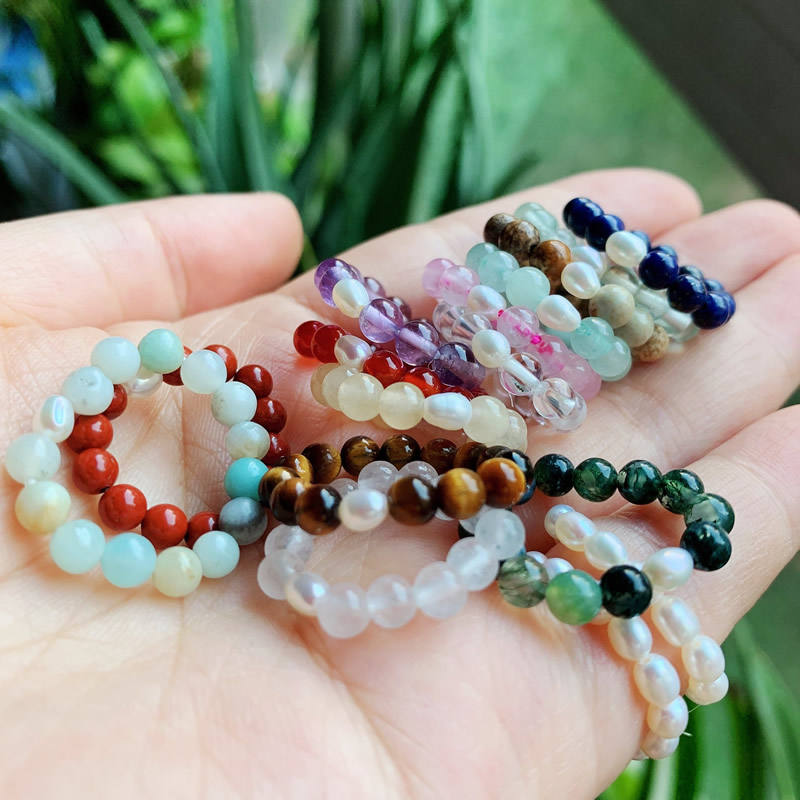 แหวนหินธรรมชาติบำบัดจักระ แหวนคริสตัลควอตซ์หลากสี ประดับมุกแท้ แหวนลูกปัดยืดหยุ่น ปรับขนาดได้ ซ้อนกันได้