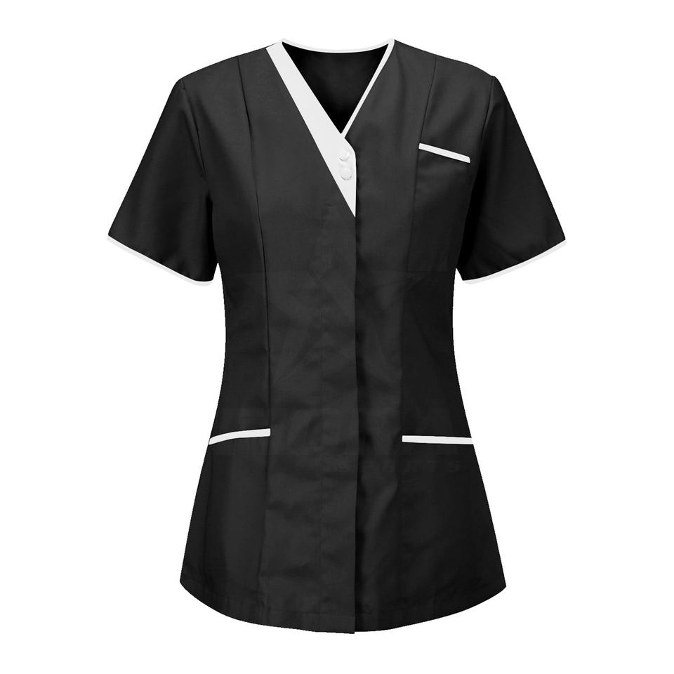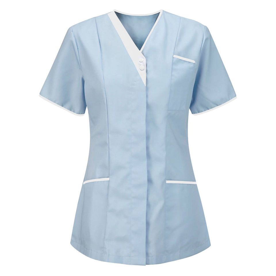 เสื้อคลุมพยาบาลสีฟ้าสดใส ทนทานต่อการฟอกสี สำหรับคลินิกในสหราชอาณาจักร เสื้อทูนิคสำหรับผู้หญิง