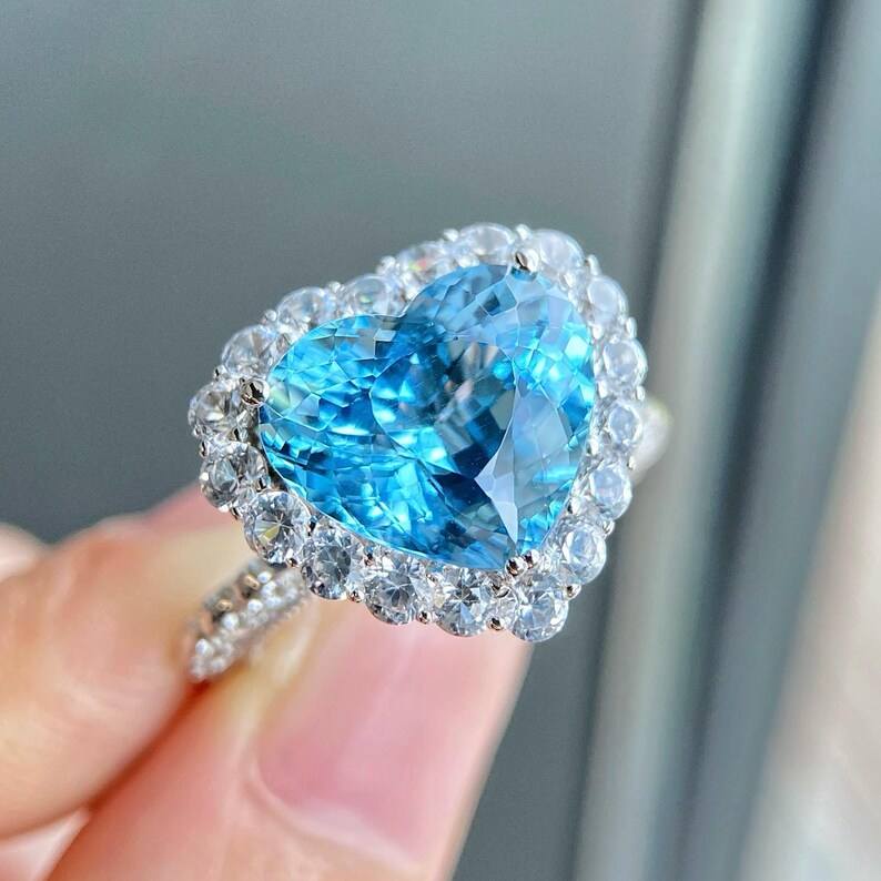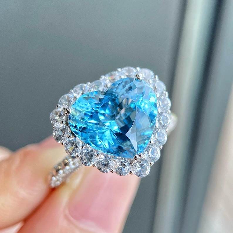 แหวนอะความารีนทรงหัวใจประดับเพชรรอบวง ทองคำขาว 18K งานแฮนด์เมด สำหรับหมั้นและแต่งงาน เครื่องประดับชั้นดี ของขวัญสำหรับผู้หญิง สวยสง่า