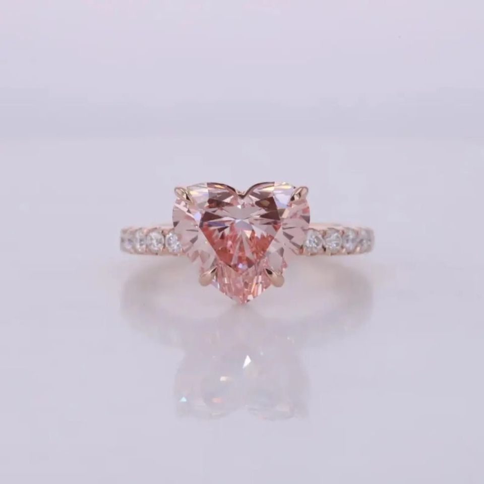 แหวนเพชรทรงหัวใจสีชมพูสดใส 3 กะรัต เพชรเลี้ยงในห้องปฏิบัติการ ตัวเรือนทอง 18K/เงิน 925 ชุบโรเดียม แหวนแบบ Halo Solitaire สำหรับวันเกิด - ได้รับการรับรองจาก GIA/IGI