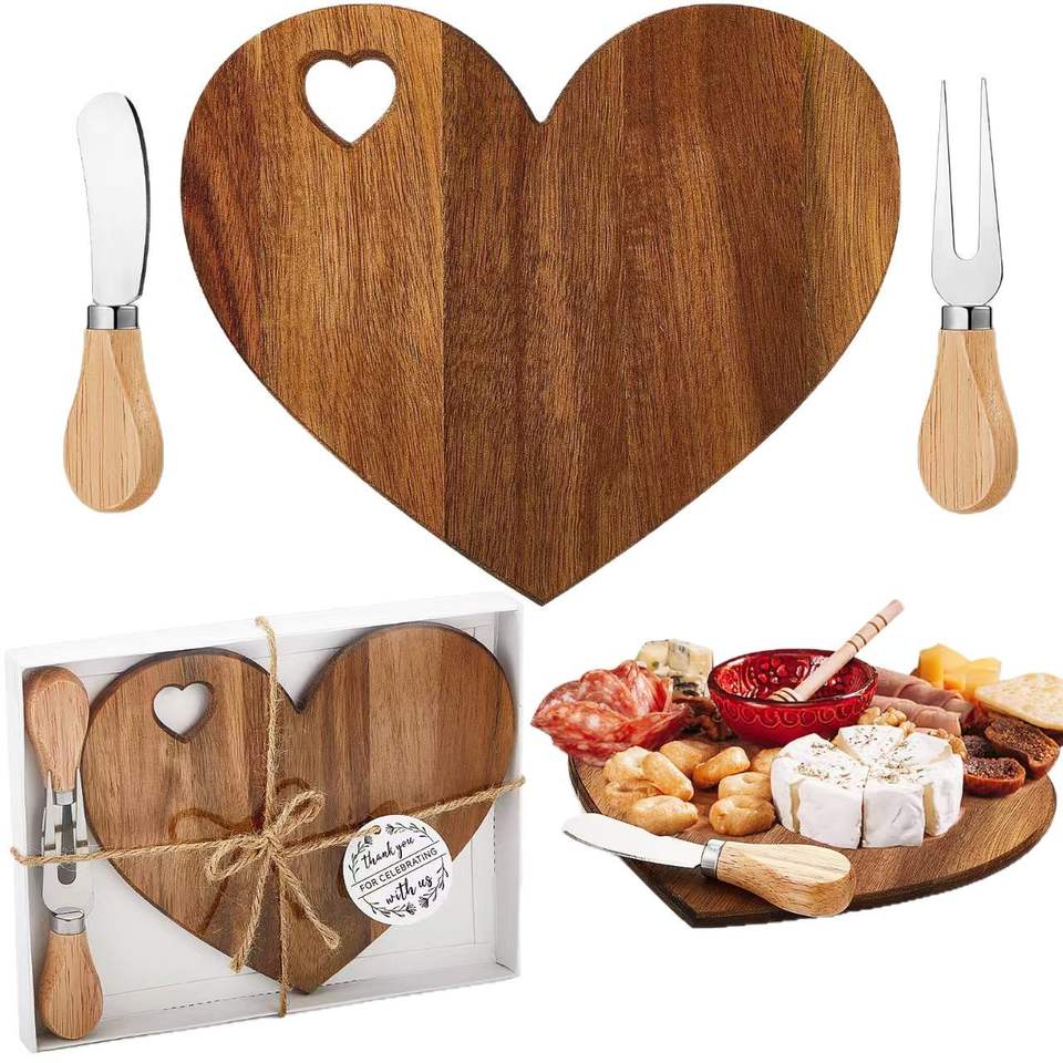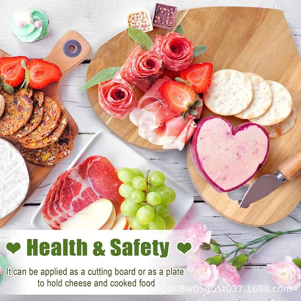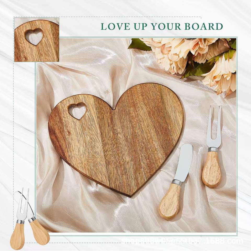 เขียงไม้ทรงหัวใจทำจากไม้กระถินพร้อมชุดมีดและส้อมสำหรับเสิร์ฟเค้กและผลไม้ ล้างทำความสะอาดด้วยมือเท่านั้น