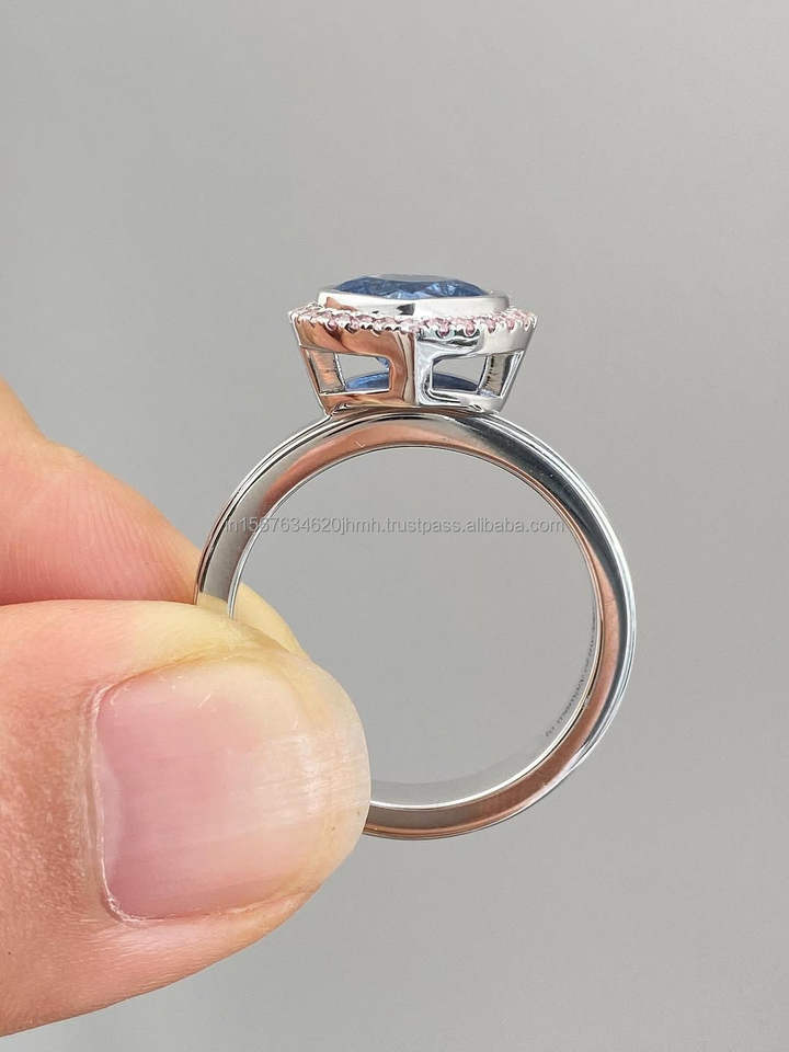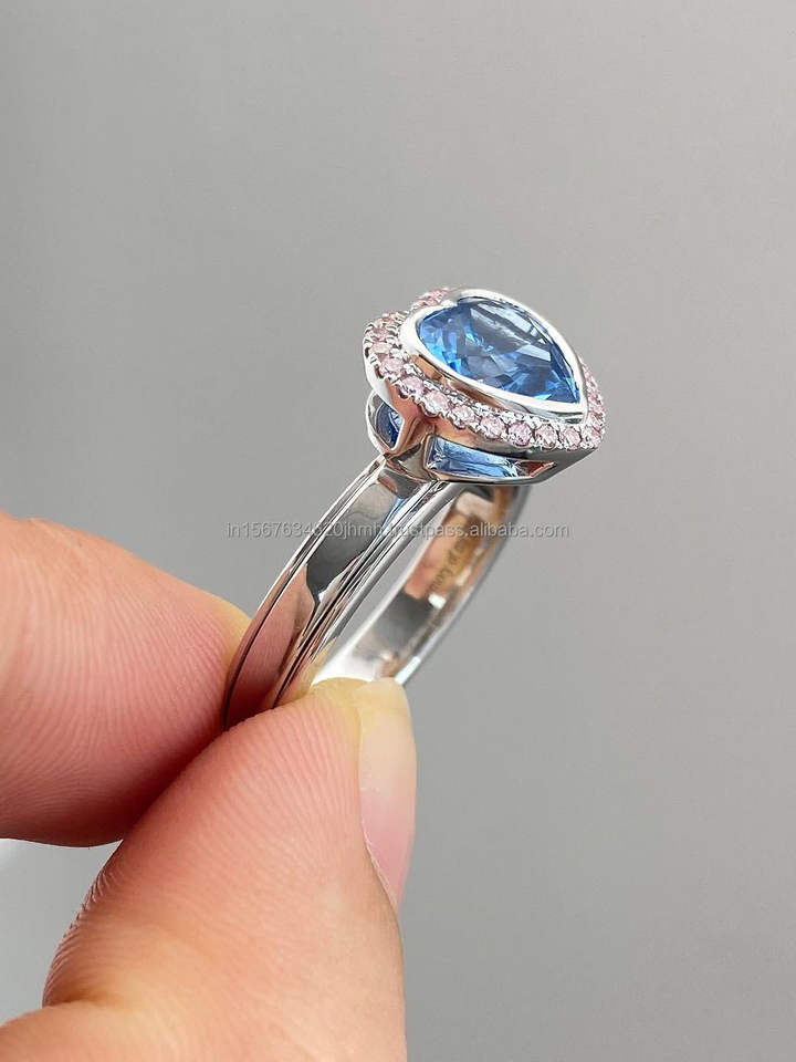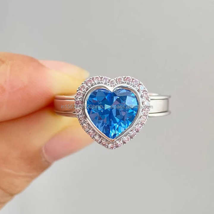 แหวนเพชรรูปหัวใจสีน้ำเงินพร้อมวงแหวนสีชมพู แหวนหมั้นทองคำขาวหรูหรา ของขวัญเครื่องประดับสุดโรแมนติก