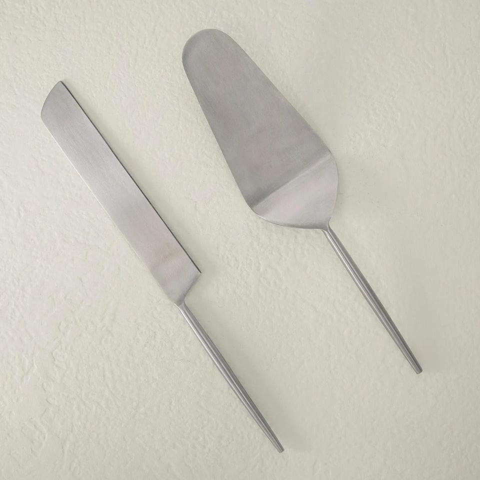 ชุดอุปกรณ์เสิร์ฟเค้กสแตนเลสทรงหัวใจ ดีไซน์สวยงาม พร้อมไม้พายและมีดเสิร์ฟขนมสีทอง สำหรับร้านอาหารและโรงแรม ขายส่ง