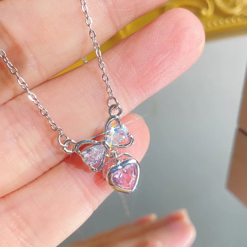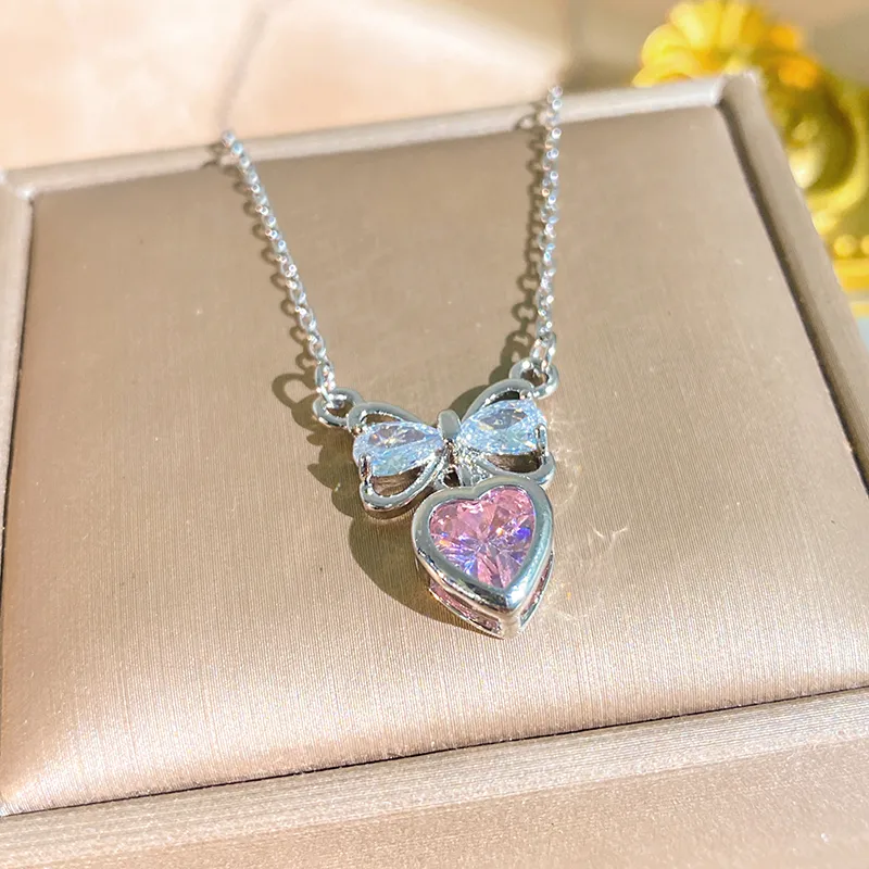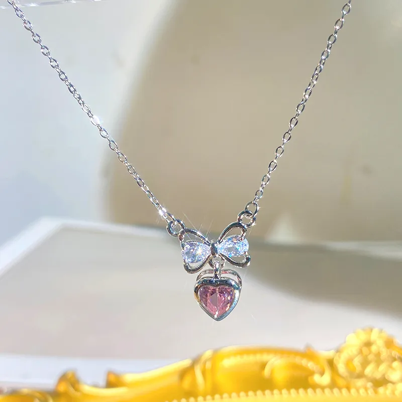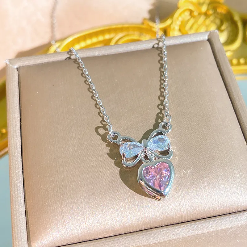 สร้อยคอรูปหัวใจสำหรับผู้หญิง ทำจากสแตนเลส 304 ชุบ K สีขาว ความหนา 0.03µm ประดับด้วยเพทายบนสายเคเบิล
