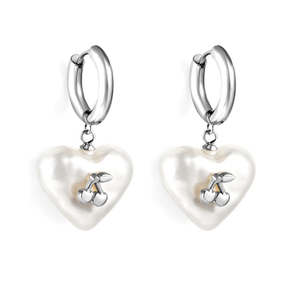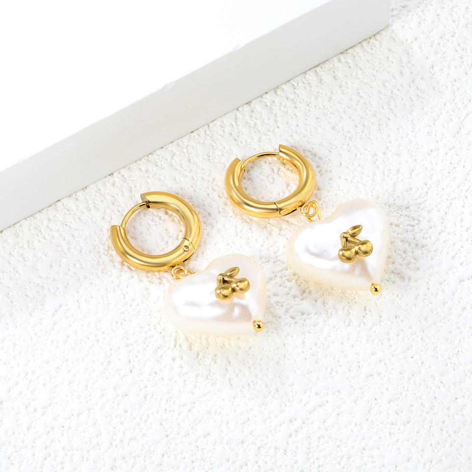 ต่างหูห่วงสแตนเลสรูปหัวใจพร้อมเสน่ห์ไข่มุกเชอร์รี่สีทองสำหรับผู้หญิงเครื่องประดับแฟชั่น