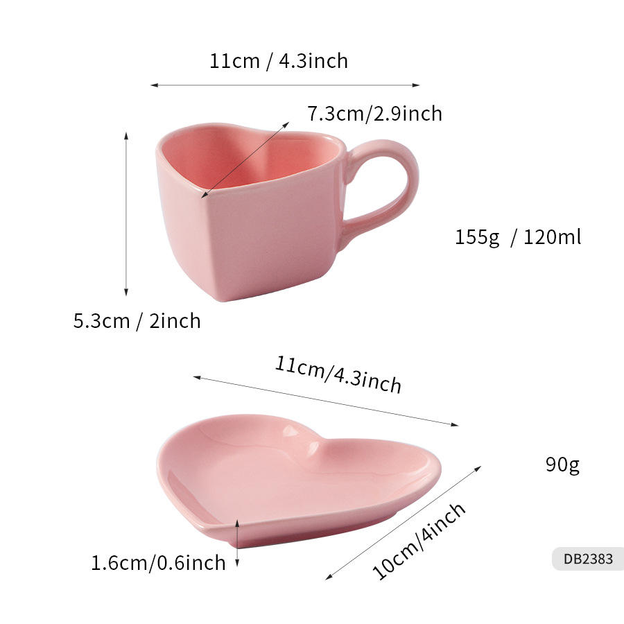 ชุดแก้วกาแฟเซรามิครูปหัวใจพร้อมจานรอง สีชมพูแดงล้วน สำหรับดื่มชายามบ่าย ใช้ในบ้าน มีหูจับ