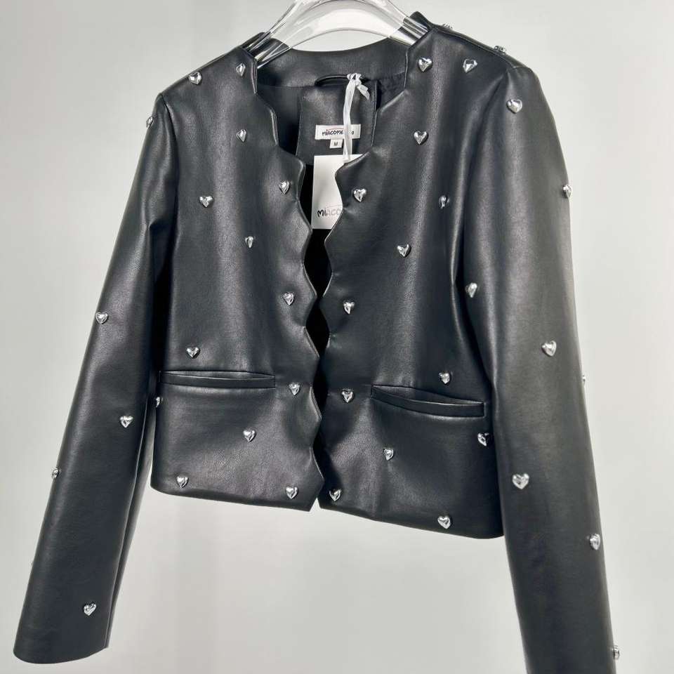เสื้อแจ็คเก็ตหนังผู้หญิงแบบครอปประดับหัวใจ สามารถเลือกสีและขนาดได้ แฟชั่นคอวี เสื้อโค้ทหนัง PU สั้น