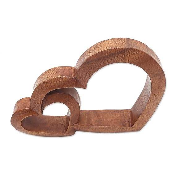 งานแกะสลักไม้รูปหัวใจสีน้ำตาล สองหัวใจรวมกัน สื่อถึงความรัก การแบ่งปัน งานศิลปะไม้ทำมือ ของตกแต่งบ้าน ของขวัญสุดโรแมนติก