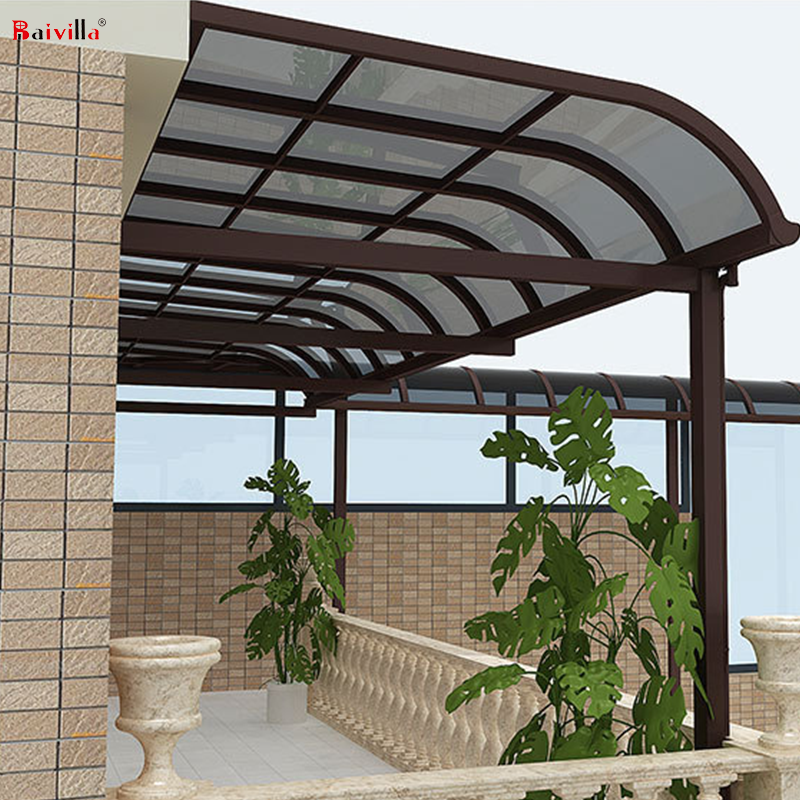 แผ่นโพลีคาร์บอเนตกันความร้อน หลังคาโค้ง กันสาด พร้อมรางน้ำฝนในตัว โครงอะลูมิเนียม สำหรับบ้านพักตากอากาศกลางแจ้งแบบเรียบง่าย จอดรถได้