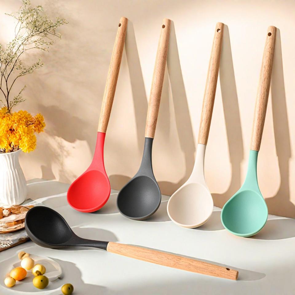 ทัพพีซิลิโคนทนความร้อนพร้อมด้ามไม้ ชุดช้อนเสิร์ฟอาหารแบบไม่ติดกระทะ สำหรับใช้ในครัว 4 ชิ้น