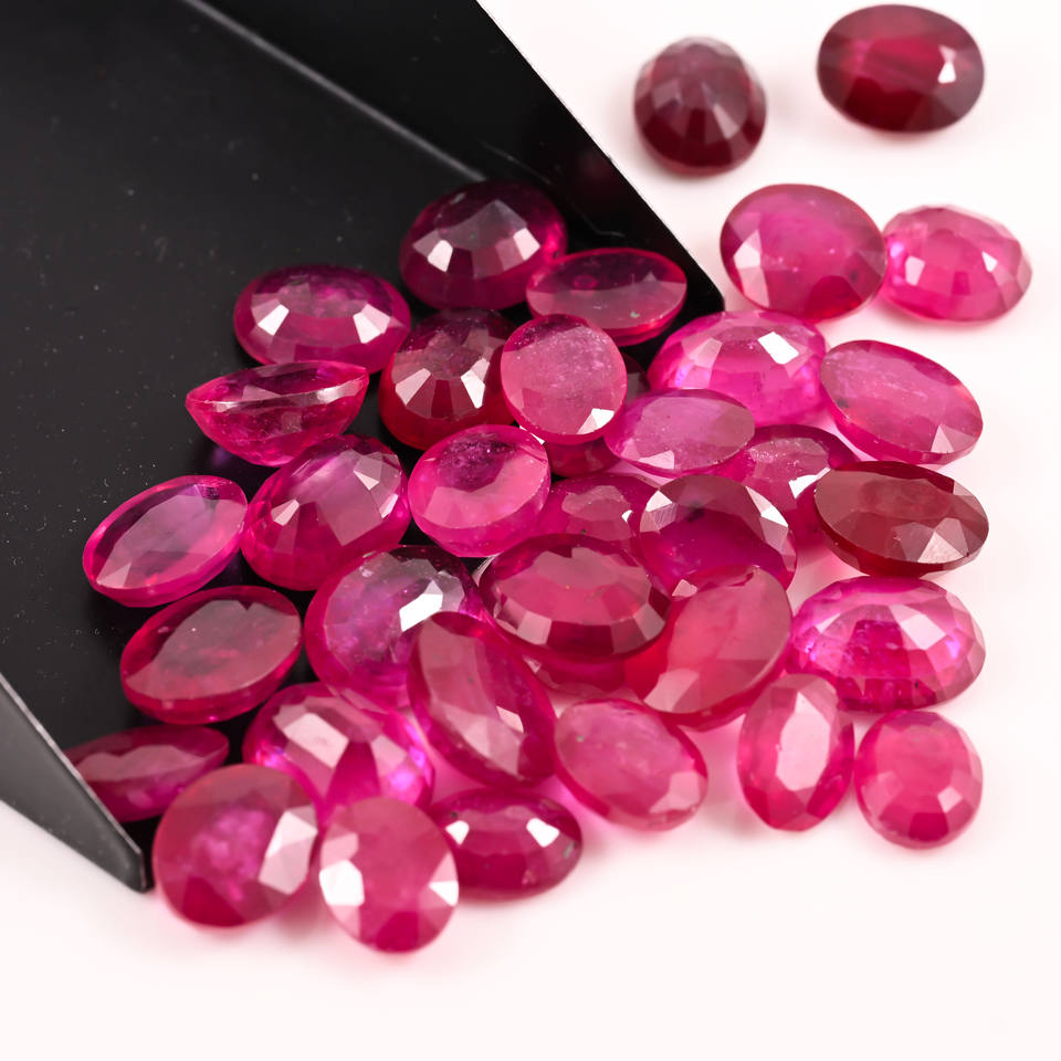 พลอยทับทิมทรงรีเหลี่ยมเพชรพลอย ขนาด 8x10 มม. ผลิตในห้องปฏิบัติการ ผ่านกระบวนการให้ความร้อนและเติมแก้ว นำเข้าจากเหมืองซูดาน สำหรับทำเครื่องประดับ น้ำหนักรวม 3000 กะรัต จำหน่ายเป็นกิโลกรัม