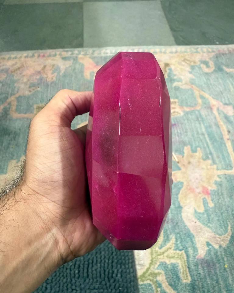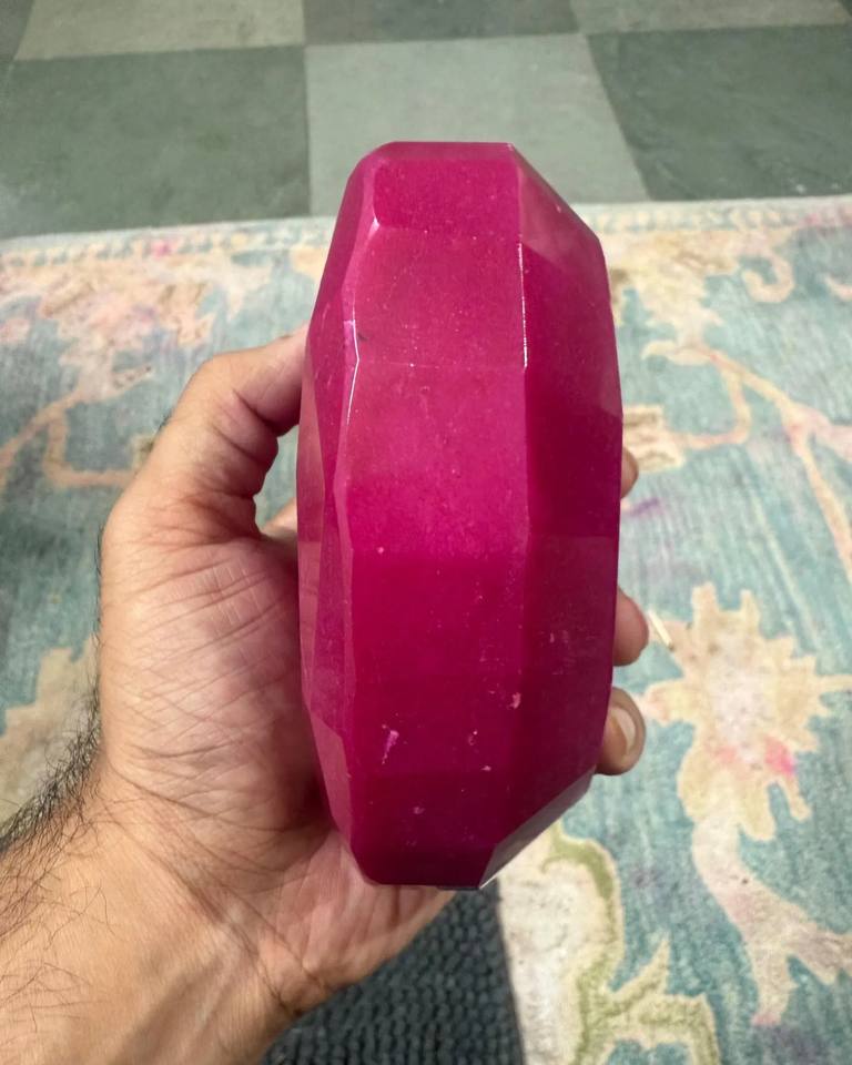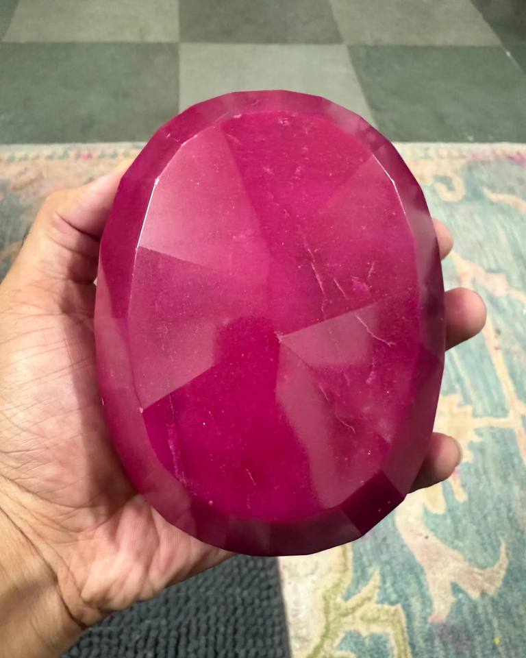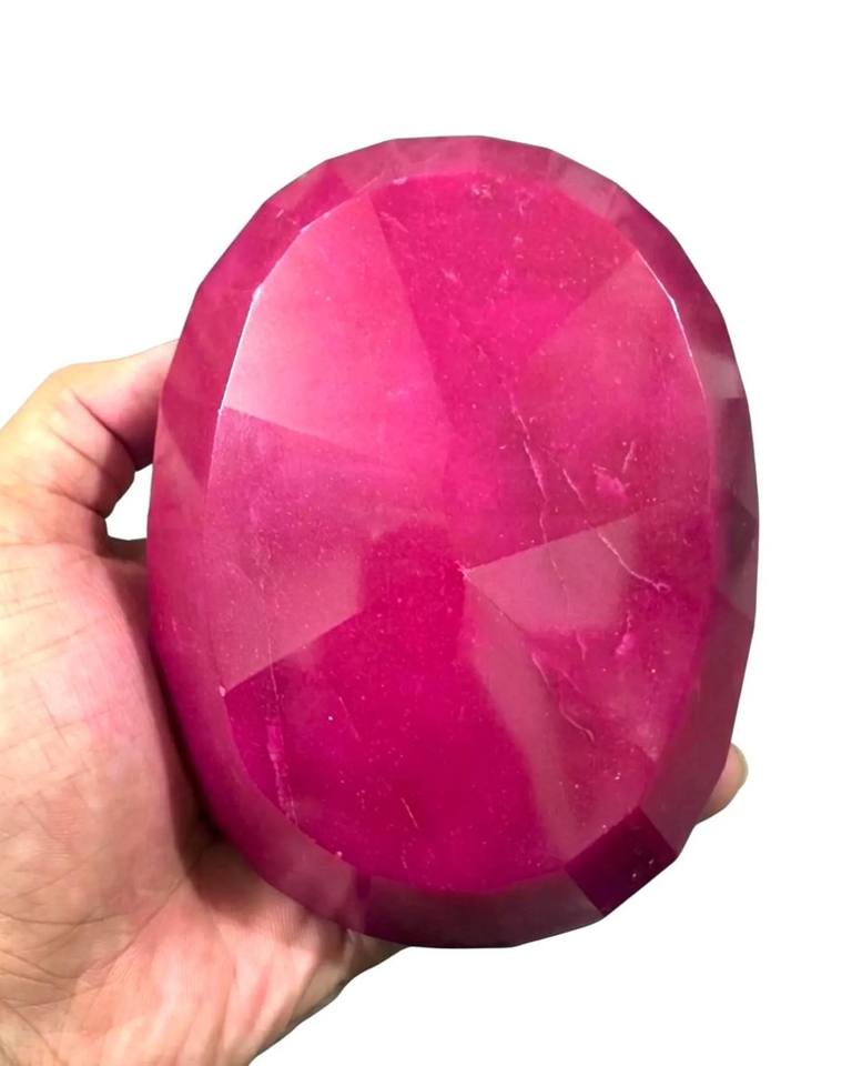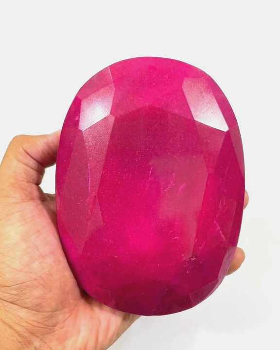 พลอยทับทิมสีแดงเข้มทรงรีเจียระไนแบบมรกต ขนาด 3000 กะรัต พลอยธรรมชาติเม็ดเดี่ยว ขัดเงา สีแดงเข้ม ขนาดใหญ่