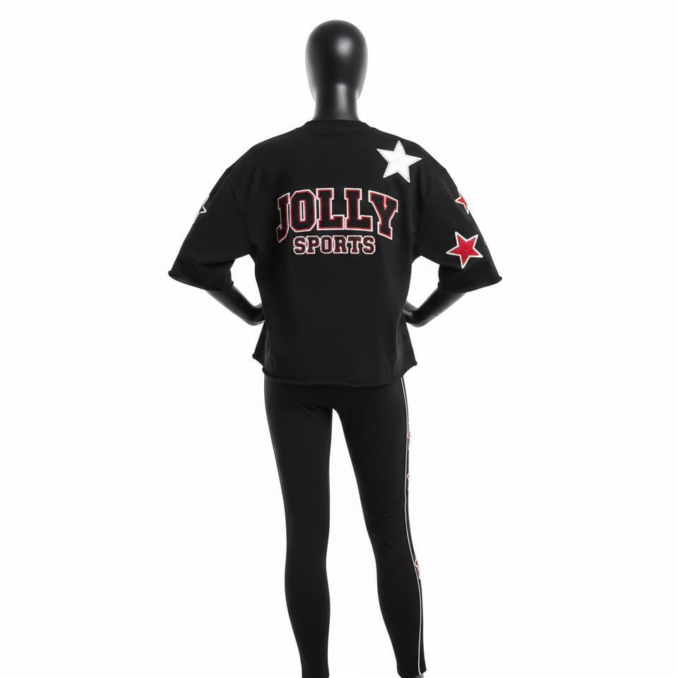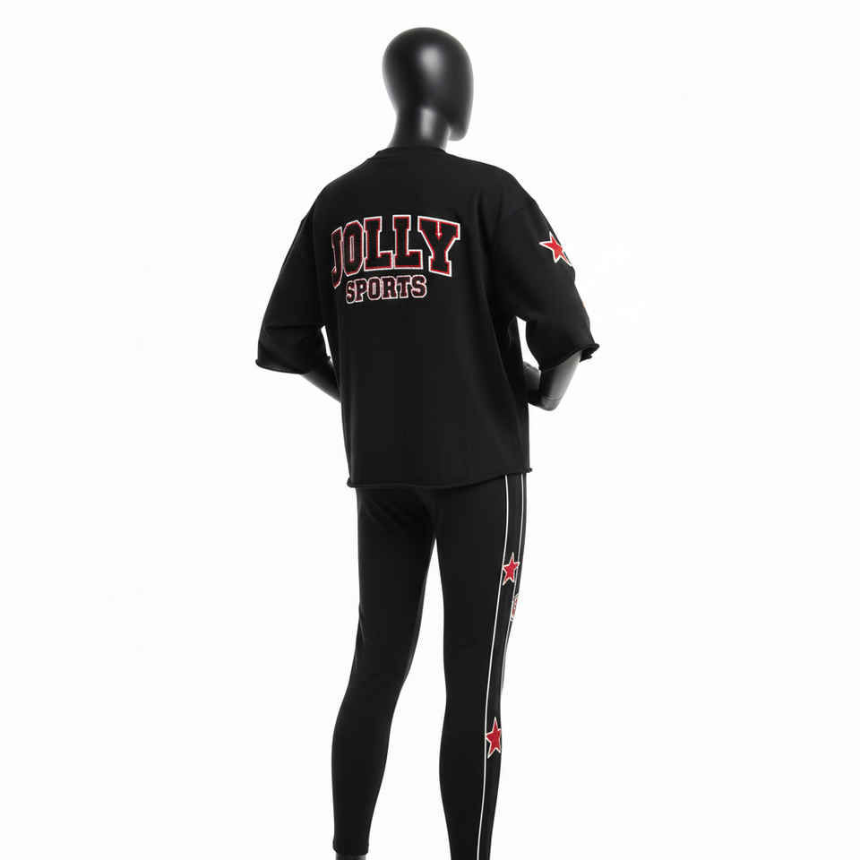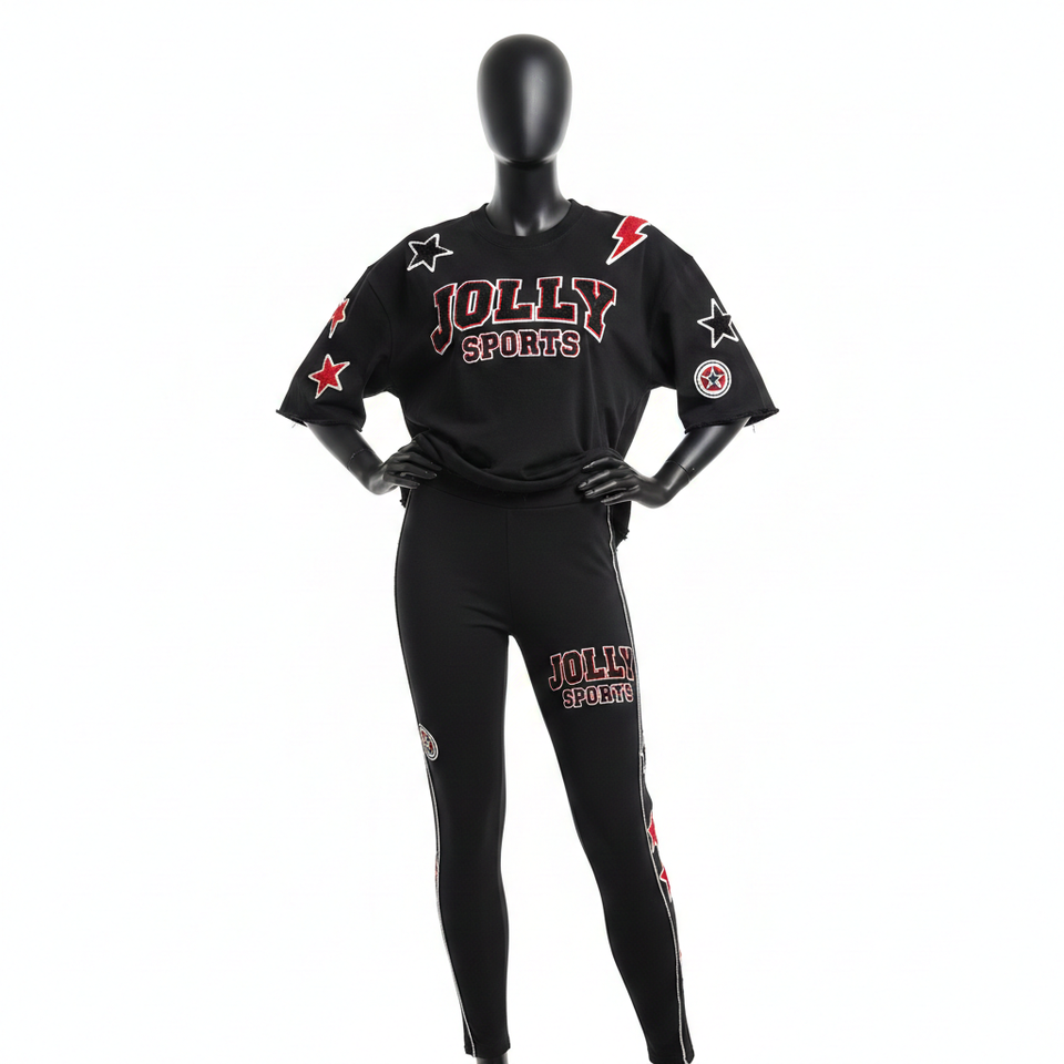 เสื้อยืดผ้าฝ้ายหนา 230 GSM สำหรับผู้หญิง และกางเกงเลกกิ้งสีดำ แดง ขาว ปักลายปะ พร้อมปักโลโก้ตามสั่ง ชุดเซ็ตสำหรับผู้หญิง